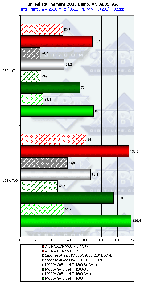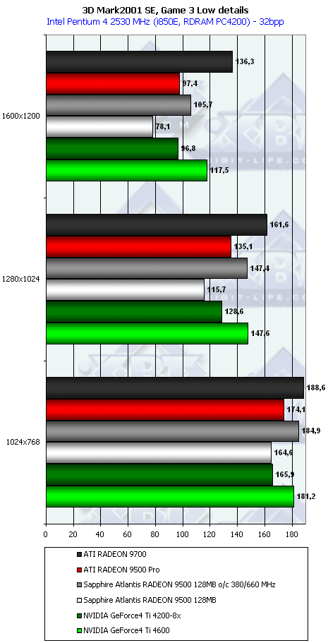 Примечание: В диаграммах по техническим причинам не присутствует RADEON 9500 64MB, но сравнение с ним проводилось, в таблице сравнений эта карта имеется. Хотя, по совести, такому огрызку красная цена не выше $100, за большую сумму он не заслуживает внимания.
