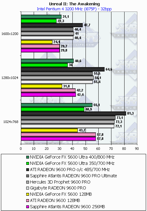 | RADEON 9600 PRO | GFFX5600 Ultra 400/800 MHz | 59,9 | 53,1 | 45,4 |