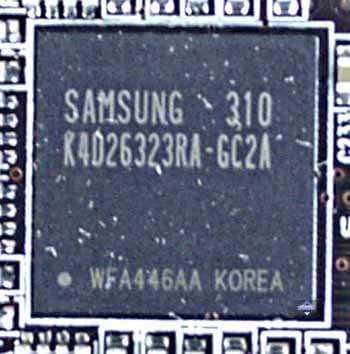 | Микросхемы памяти Samsung. Время выборки у микросхем памяти 2,8 ns, что соответствует частоте работы 350 (700) МГц, память же работает на частоте 300 (600) МГц. Частота работы GPU 400 MHz. | ![]() |