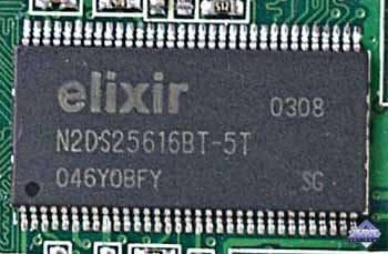 | Микросхемы памяти Elixir. Время выборки у микросхем памяти 5 ns, что соответствует частоте работы 200 (400) МГц, на которой память и работает. Частота работы GPU 325 MHz. | ![]() |