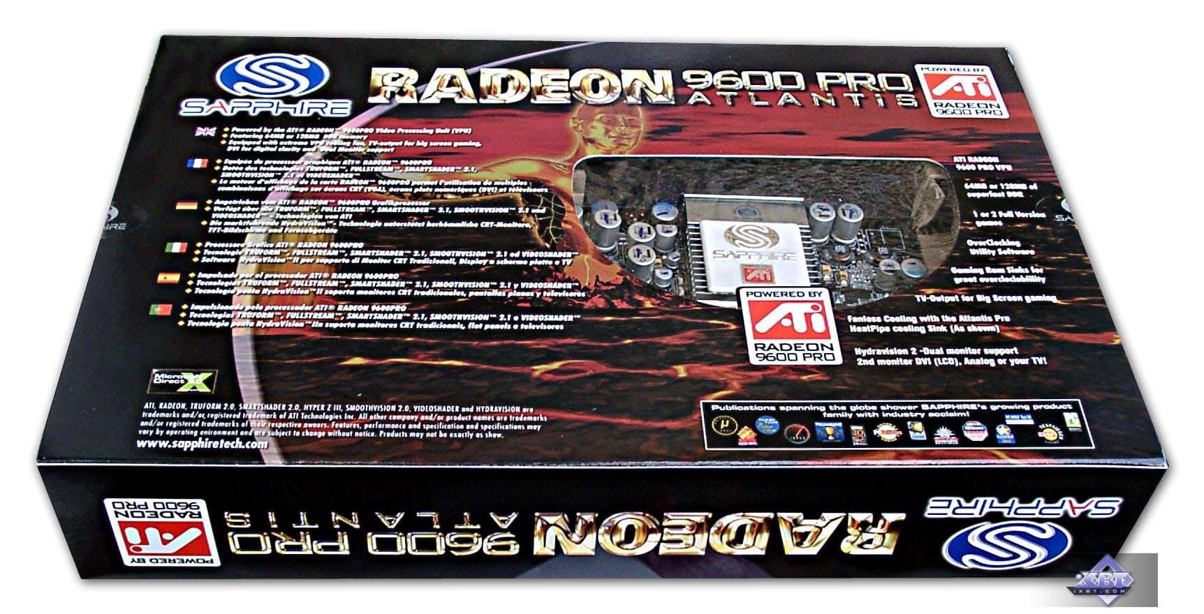 - Sapphire Atlantis RADEON 9600 256MB этот выпуск продиктован только маркетинговыми интересами, чтобы только избавиться от залежей старой памяти на складах, а также поэксплуатировать супер-емкость памяти в 256 мегабайт среди малопросвещенных пользователей.