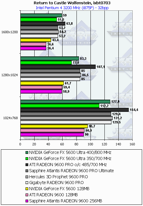 - Return to Castle Wolfenstein (MultiPlayer) (id Software/Activision) OpenGL, мультитекстурирование, ixbt0703-demo, настройки тестирования все на максимально возможном уровне, S3TC OFF, конфигурации можно скачать тут