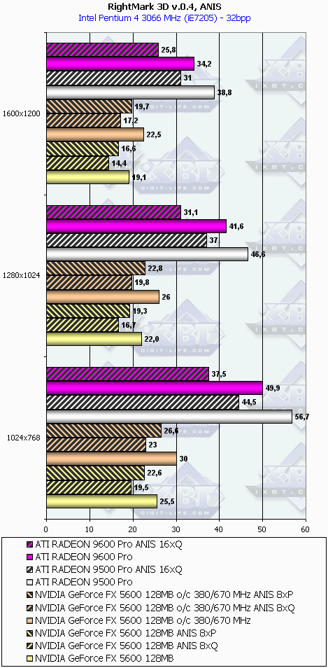 К сожалению, в этом тесте у GeForce FX не работает анизотропия, поэтому сравнений в этих режимах нет. Вина драйверы от NVIDIA.