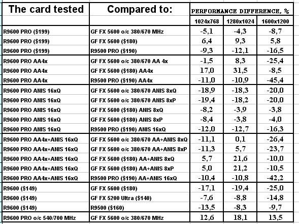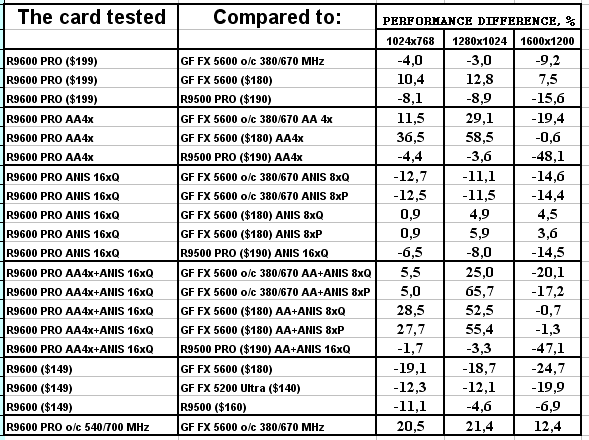 Фактически проигрыш разогнанному 5600, кроме режима с АА. Относительно GF FX 5600 еще как-то карта смотрится, но все же ценовые категории разные.