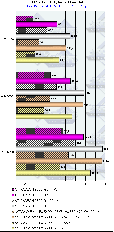 Что хотелось бы отметить. Учитывая, что RADEON 9600 PRO позиционируется на уровне GeForce FX 5600 Ultra, то есть как старшая модель из mainstream-ряда, а также то, что пока у нас нет в лаборатории 5600 Ultra на новых частотах 400/800 МГц, мы разогнали имеющуюся у нас карту на базе FX 5600 до 380/670 МГц, чтобы хотя бы примерно показать соотношение. Поэтому при просмотре результатов прошу учесть, что скорость у реальной 5600 Ultra будет еще несколько выше.