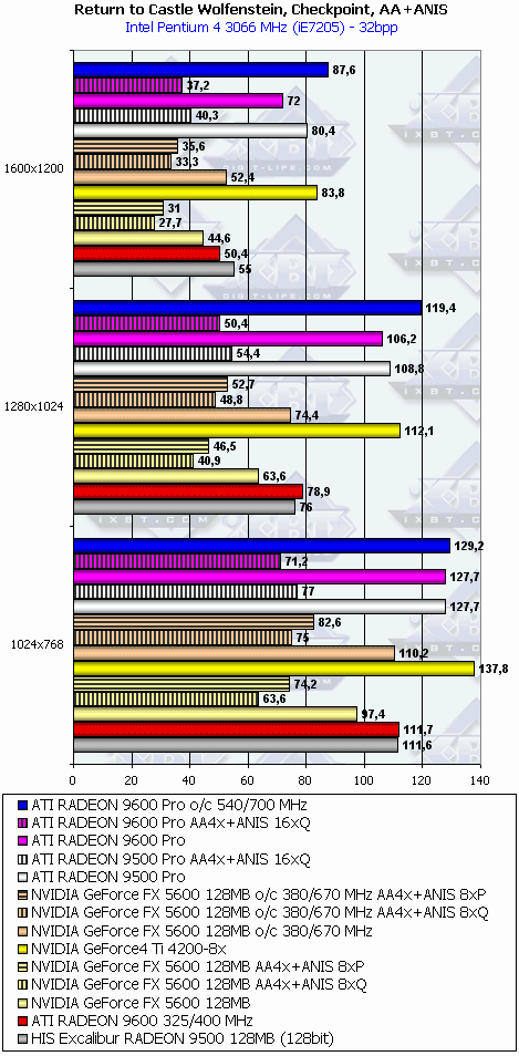 А вот тут картина полностью другая. Превосходство RADEON 9600 PRO весьма велико, особенно в режимах с АА. К сожалению, анизотропия все "скушала", и в самых тяжелых режимах детище ATI проигрывает сопернику.