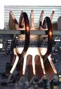 Приклеивать к корпусу микросхемы не хотелось, потому что в данном случае при попытке снять радиаторы, возникли бы проблемы. В ходе долгих раздумий был выбран способ крепления с помощью клипс. Принцип их действия основывается на эффекте "памяти металла", который заключается в следующем: после придания металлу определенной формы, полученной путем изгибания и последующего его разгибания в разумны пределах, он будет возвращаться к исходному состоянию (к состоянию, в котором он находился до разгибания). Для организации крепления была использована медная проволока диаметром 2 мм. Концы изогнутой клипсы прижимают радиаторы, установленные на память с противоположных сторон. Результат проделанной работы виден на снимках: