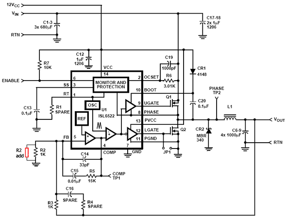 Выходное напряжение, как у микросхемы ISL6522, задается соотношением резисторов в цепи обратной связи. Шунтирующий резистор припаивается между выводами 18 и 20.