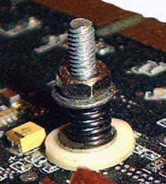 - Виниловая шайба (обеспечивает электроизоляцию системы крепежа радиатора от элементов платы видеоадаптера и равномерного распределения нагрузки, создаваемой весом радиатора на плату);