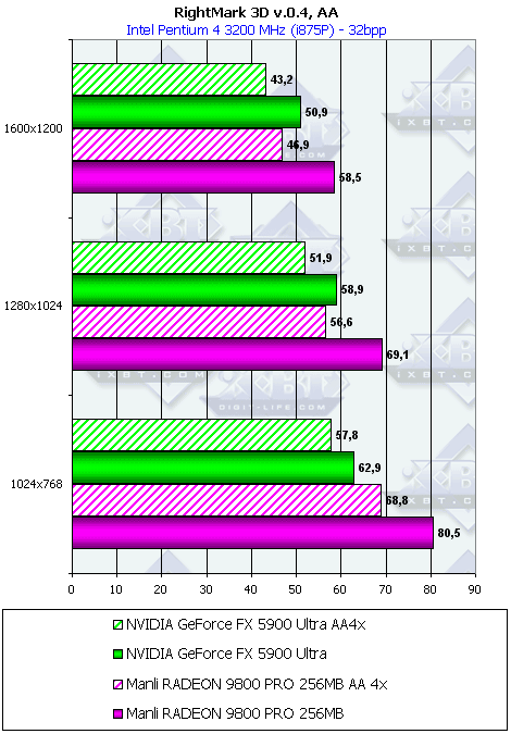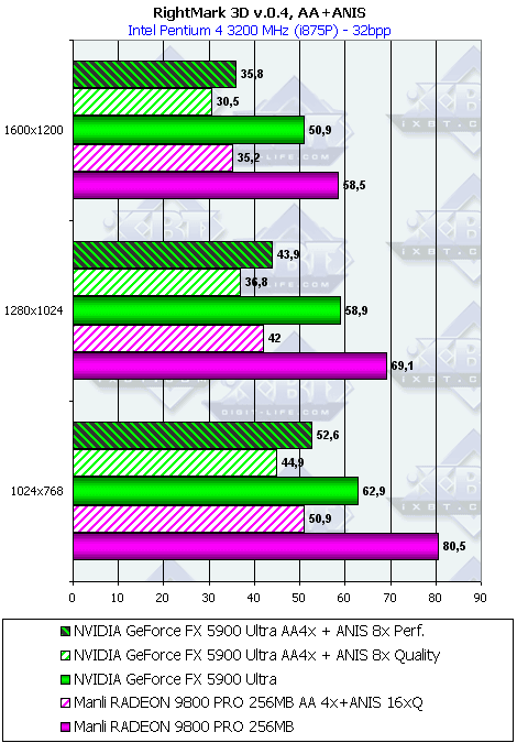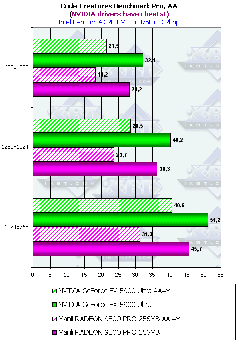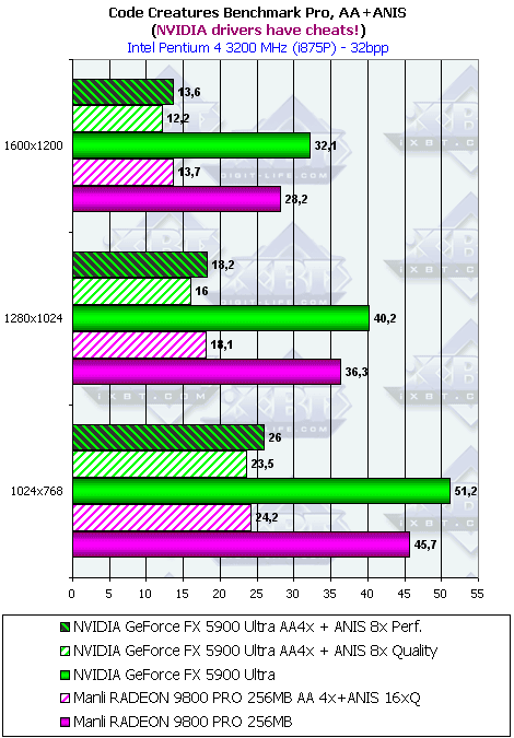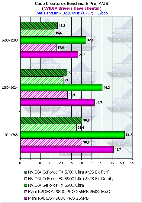 Да, прошу обратить внимание на то, что драйвера nVIDIA в данном тесте «шельмуют», это было доказано нашими обзорами. Мы пока лишь обнаружили резкое падение скорости у FX 5900 на версии 44.90, когда производительность стала равной той, что мы видели ранее с Anti-Detect.