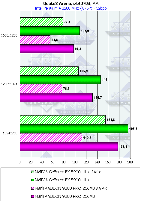 - Quake3 Arena v.1.17 (id Software/Activision) OpenGL, мультитекстурирование, ixbt0703-demo, настройки тестирования все на максимальном уровне: уровень