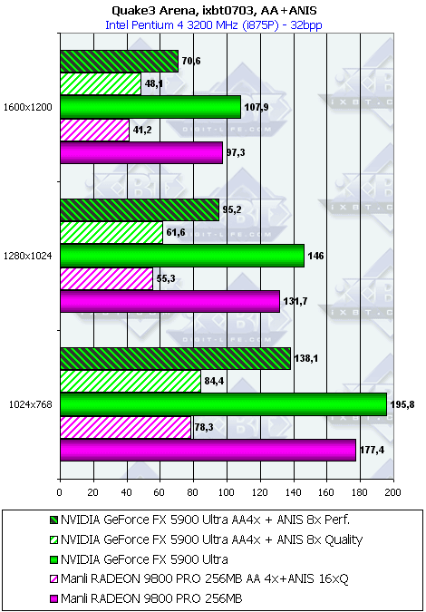 А тут победа RADEON 9800 PRO. Хотя при анизотропии все же проигрыш имеется. Опять можно сказать, что в целом примерное равенство.