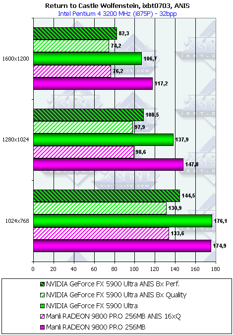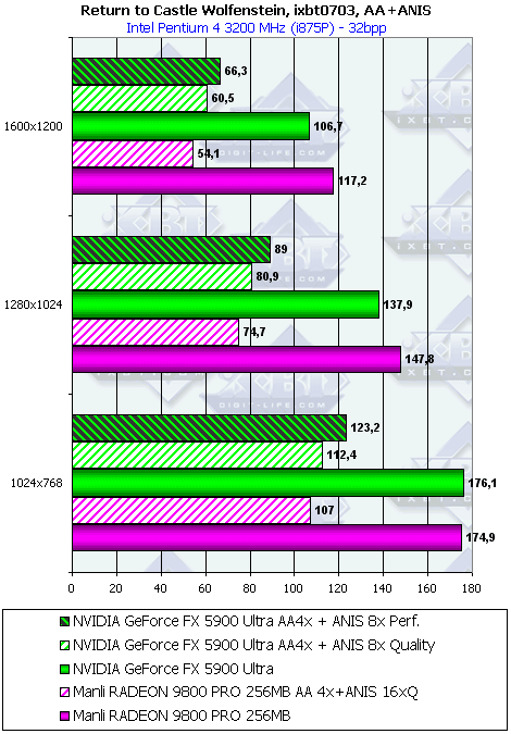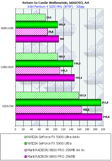 - Return to Castle Wolfenstein (MultiPlayer) (id Software/Activision) OpenGL, мультитекстурирование, ixbt0703-demo, настройки тестирования все на максимально возможном уровне, S3TC OFF, конфигурации можно скачать тут