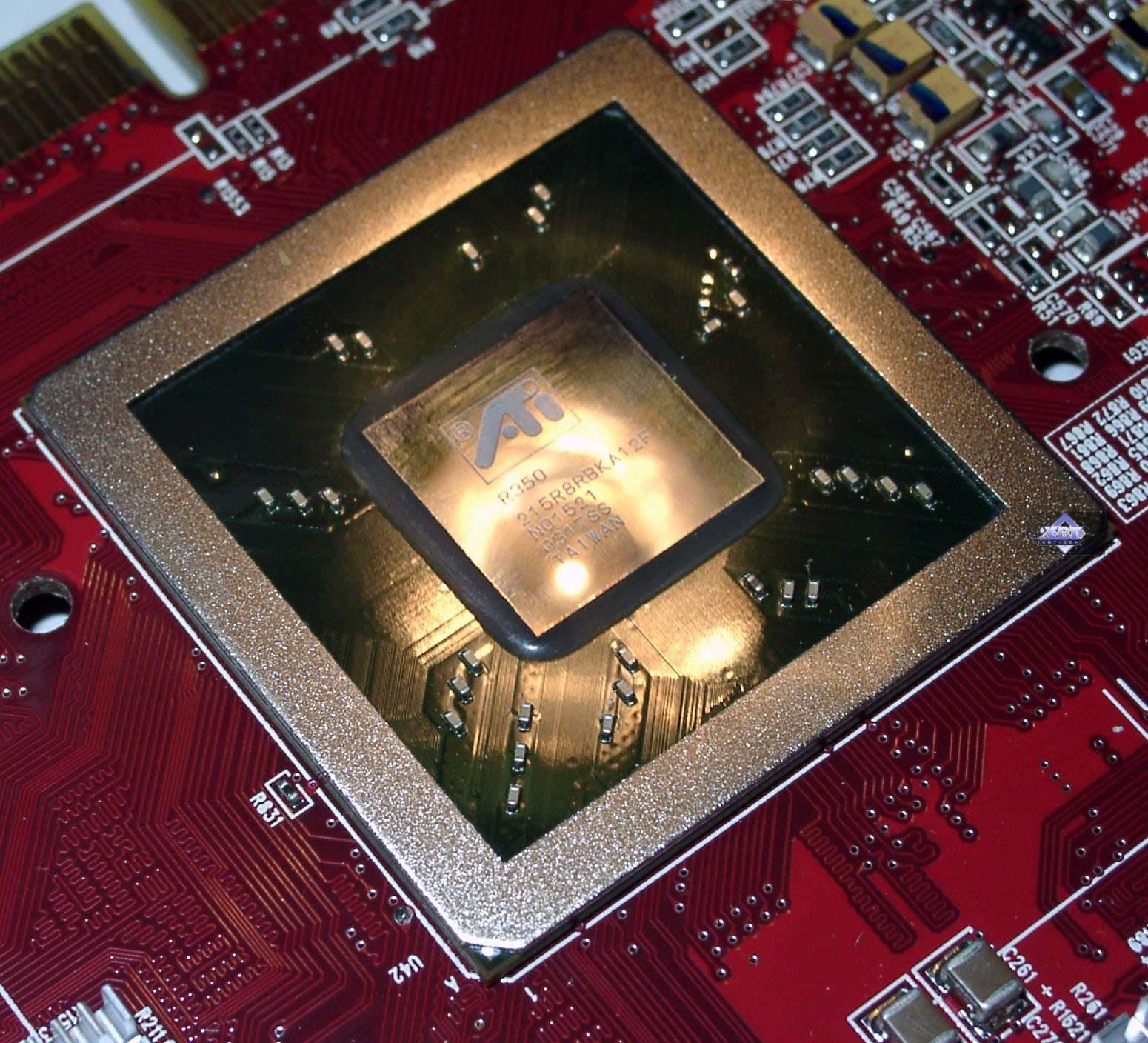 Под радиатором можно найти и сам процессор, имеющий кодовое название R350. На коллаже в начале статьи хорошо видно, какая зеркальная у чипа поверхность.