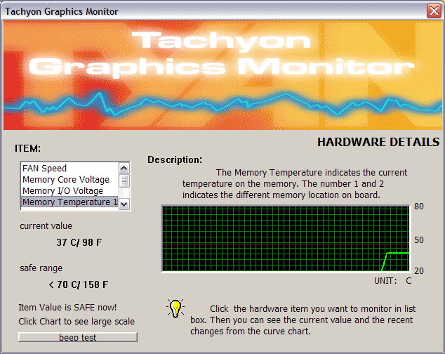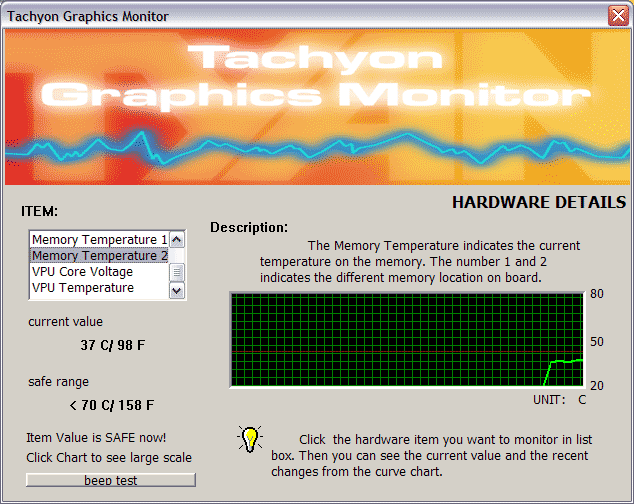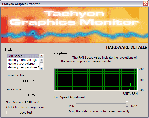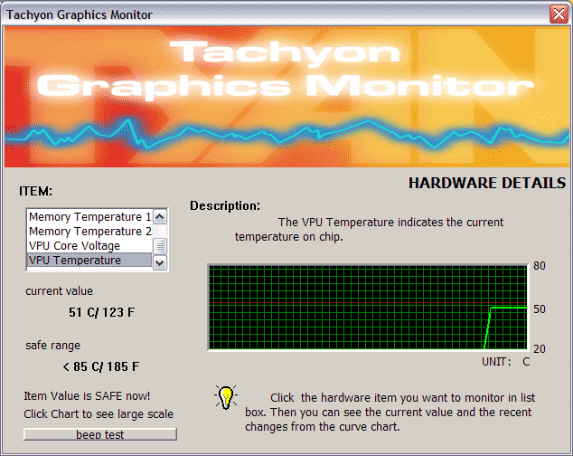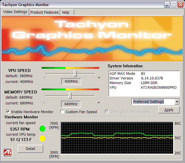 На PCB в правом верхнем углу установлен спикер, который в случае какого-либо отклонения параметров контроля от границ номинала оповестит владельца об этом. Сама программа TGM находится в панеле задач внизу справа. Обратим также внимание на то, что в качестве бонуса в утилите есть и оверклокер. Но это не просто бонус… Ведь при загрузке этой утилиты выставляется повышенная частота работы ядра — 400 МГц, а не 380, как у всех остальных RADEON 9800 PRO.