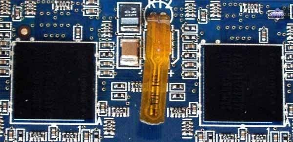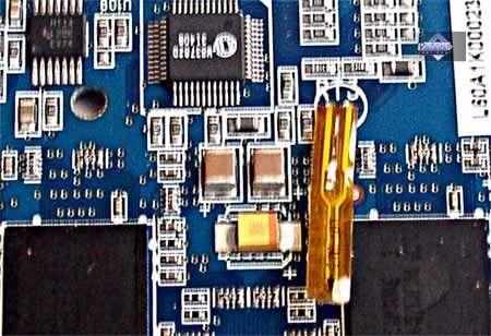 Как мы видим, осуществляется контроль вольтажа на ядре и на памяти, температуры на ядре (видимо, средствами самого процессора), на верхнем блоке микросхем памяти и на правом блоке микросхем (на каждом блоке есть по одному терморезистору). Разумеется, учитывая наличие тахометра на вентиляторе, контролируется и частота вращения последнего.