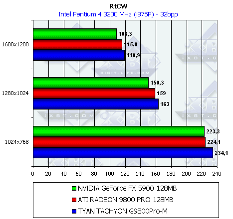 - Return to Castle Wolfenstein (MultiPlayer) (id Software/Activision) OpenGL, мультитекстурирование, ixbt0703-demo, настройки тестирования все на максимально возможном уровне, S3TC OFF, конфигурации можно скачать тут