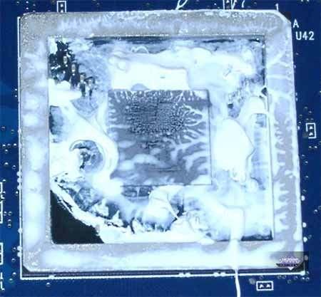 Судя по всему, залили все пространство внутри рамки по периметру подошвы процессора. После очистки следов такого расточительства термопасты :) стало возможным увидеть и сам чип: