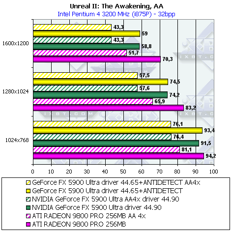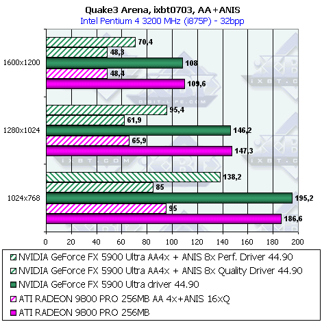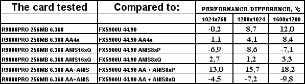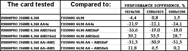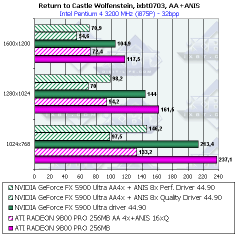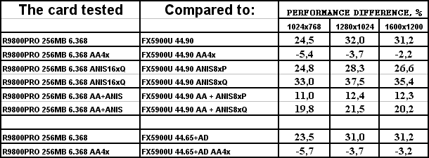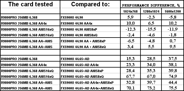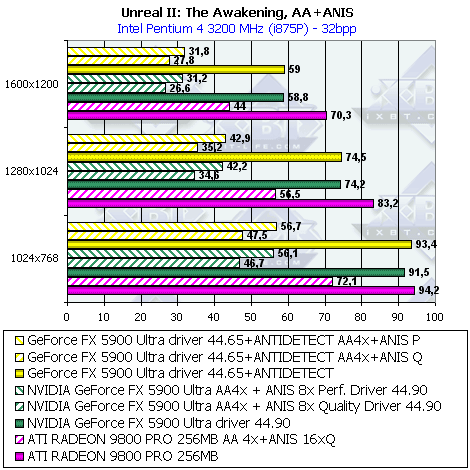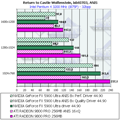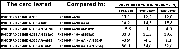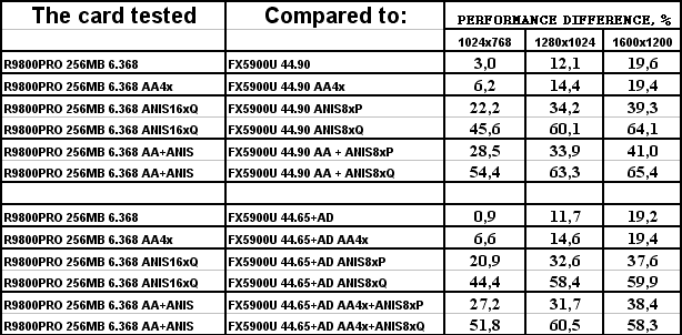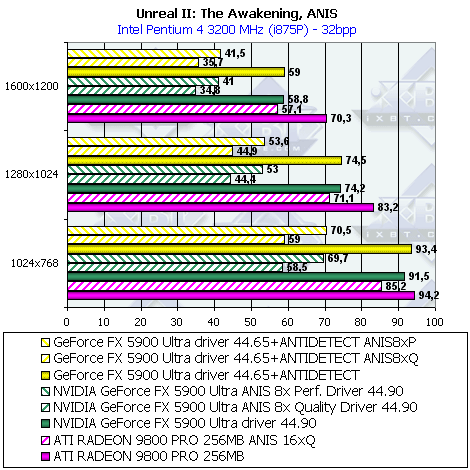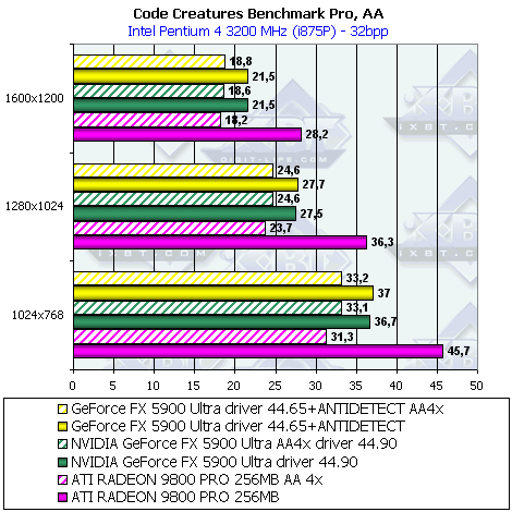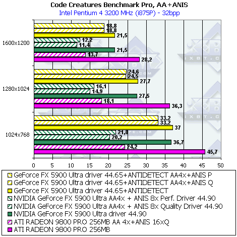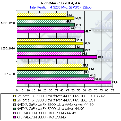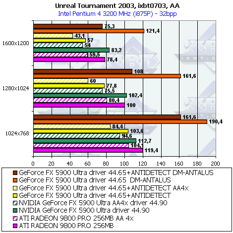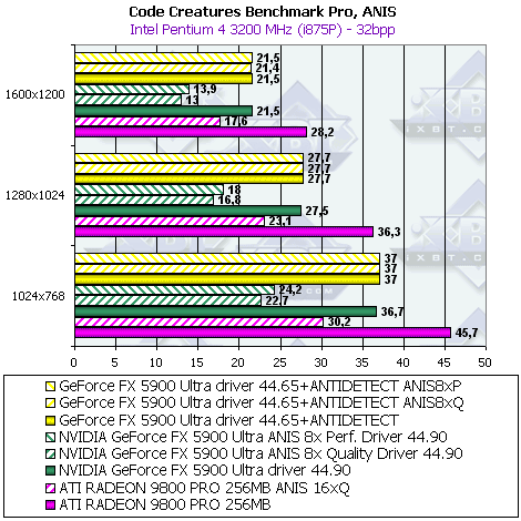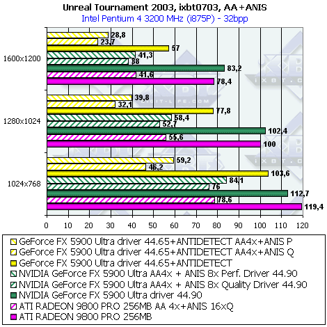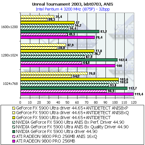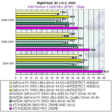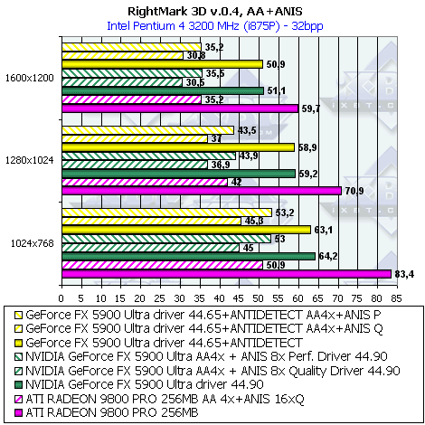 Я не зря выбрал версию 44.90 от NVIDIA для сравнения. Как показали наши исследования (о них более подробно вы сможете прочитать в ближайшем материале по FX5900 Ultra), именно в этой версии, скорее всего, были временно убраны заточки NVIDIA под данный бенчмарк. Плюс заработала полноценно анизотропия. И вот что мы получили: подавляющее преимущество RADEON 9800! Я привел еще данные тестирования FX5900 с Anti-Detect, что доказывает отсутствие заточек в 44.90. К сожалению, Anti-Detect пока работает только в версии Детонатора до 44.65 включительно, а там еще есть проблемы с анизотропией, она просто не включается, поэтому сравнить работу с AD можно только без анизотропной фильтрации. Кстати, автор Anti-Detect-а Алексей Николайчук AKA Unwinder пока размышляет на тему как драйвер от NVIDIA может не включать анизотропию в этом тесте (при ее форсировании), если включен Anti-Detect. Очевидно, что последний работает, и драйвер «не в курсе», что запущен именно этот бенчмарк. По каким признакам Детонатор не включает эту функцию? Вопрос пока открыт, мы разбираемся :-).
