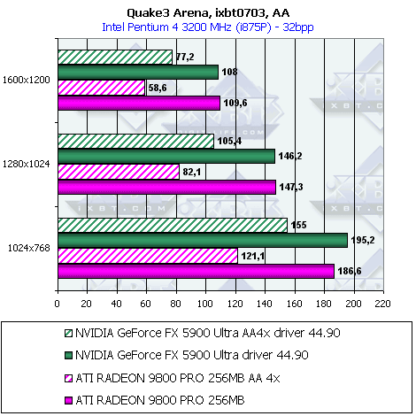 - Quake3 Arena v.1.17 (id Software/Activision) OpenGL, мультитекстурирование, ixbt0703-demo, настройки тестирования все на максимальном уровне: уровень