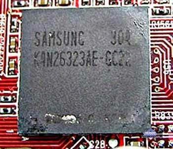 | Микросхемы памяти производства Samsung. Время выборки у микросхем памяти 2,2 ns, что соответствует частоте работы примерно 454 (908) МГц, память же работает на частоте 350 (700) МГц. Частота работы GPU 380 MHz. Интерфейс обмена с памятью 256 бит. | ![]() |