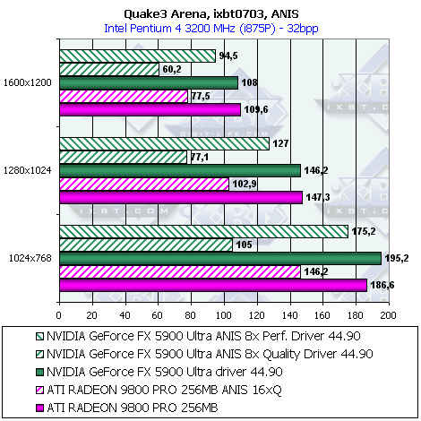 Ну примерный паритет. При сравнении с классом анизотропий Quality у RADEON 9800 скорость повыше, однако мы знаем, что качество самой функции у NVIDIA будет выше. А при сравнении с классом Performance, где у NVIDIA есть уже свои огрехи в виде упрощенной трилинейки и анизотропии на дальних объектах RADEON 9800 теряет лидерство.