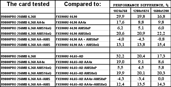 Очевидно, что ныне есть два самых мощных акселератора: RADEON 9800 PRO 256MB и GeForce FX 5900 Ultra. Но постепенное исследование тех или иных манипуляций в тестах со стороны nVIDIA ведет к тому, что RADEON 9800 PRO может стать где-то даже лидером. Единственное, что малопонятно, зачем переплачивать такие деньги за лишние 128 мегабайт. Скорость они увеличивают на мизерные проценты.