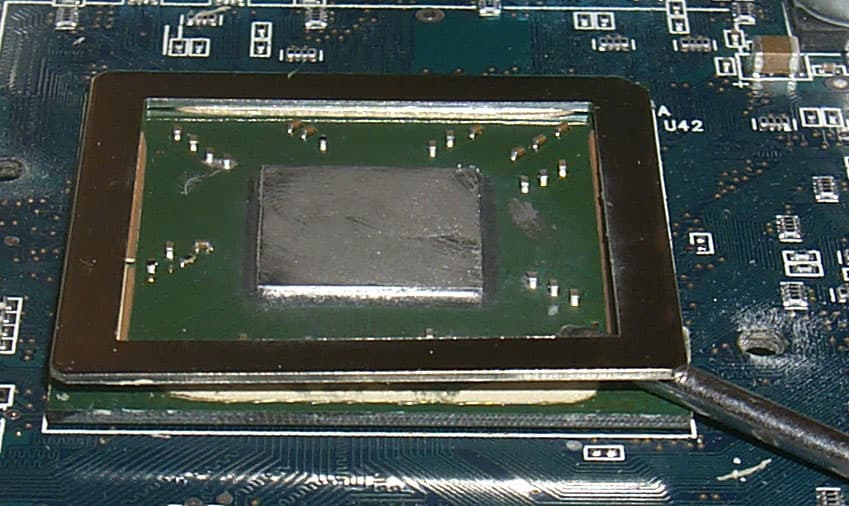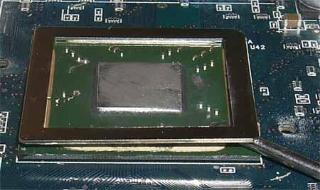 Еще когда мы рассматривали RADEON 9700 PRO, то заметили, что у многих карт высота кристалла ниже защитной рамки, которая расположена по периметру подошвы чипа. И в одном из материалов проделали эксперимент по снятию этой рамки, чтобы радиатор лучше прижимался к кристаллу: