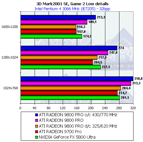 И вот перед нами тест, где огромную роль играет скорость работы шейдеров. Как известно, в этом плане у детищ ATI все в порядке в отличие от NVIDIA GeForce FX 5800. Потому мы и наблюдаем победу RADEON 9800 PRO.