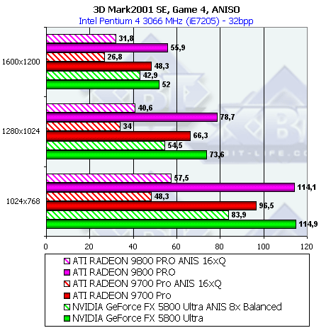 А вот этот тест нам говорит, что его любит больше ATI, чем NVIDIA :-). Несмотря на то, что при анизотропии RADEON 9800 PRO проиграл сопернику, засчет более быстрого АА новый продукт ATI в тяжелом режиме АА+анизотропия все же выиграл.