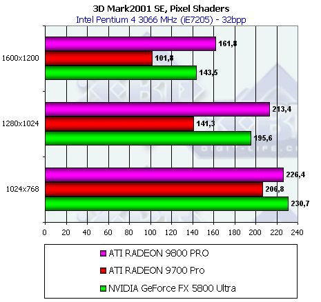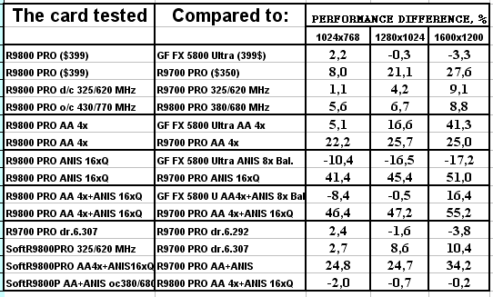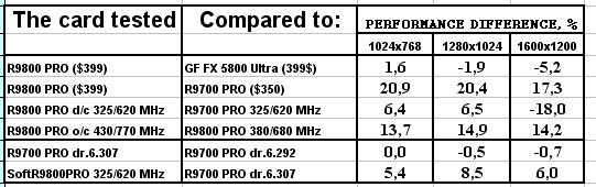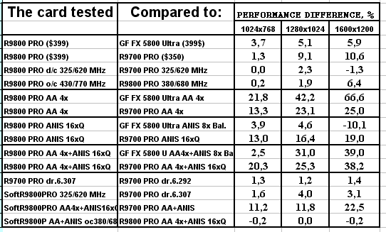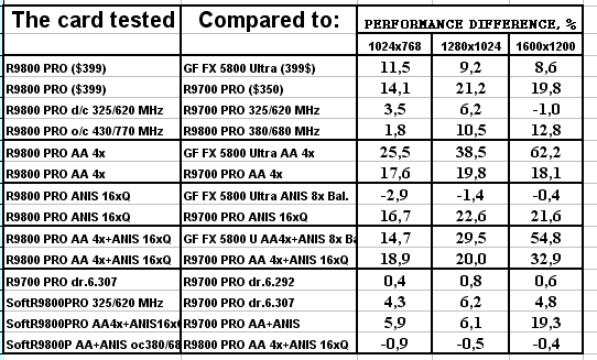 То есть, когда дело доходит до игр или тестов, под которые программисты не смогли сделать какую-либо оптимизацию в драйверах, когда процессор работает чисто своими возможностями, и когда тест активно использует современные технологии, RADEON 9800 PRO показывает явно, что он самостоятельный продукт, а не просто "улучшенная ревизия" 9700 PRO.