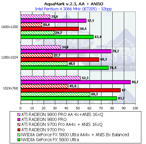Картина разнородная. В режимах без дополнительной нагрузки RADEON 9800 PRO победил (кроме 1600х1200), а вот при нагрузке АА и анизотропией проиграл сопернику, несмотря на то, что в АА выглядел по скорости лучше.