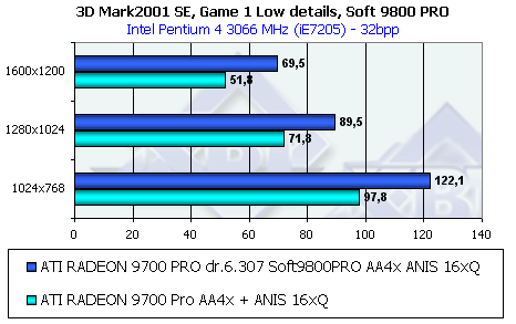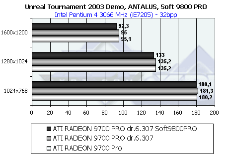 Насчет оптимизации драйверов под 9800, мы видим, что на частотах 9700 PRO она есть, да и очень даже приличная. Разогнанный до частот 9800 PRO ускоритель на базе 9700 PRO, переделанный в Soft9800 PRO показал точно такую же производительность в режимах с АА и анизотропией, что и "родной" RADEON 9800 PRO, поэтому можно вести смело речь о чистой оптимизации.