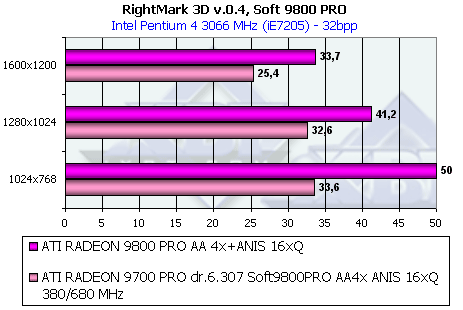 Однако что странно: Soft9800 PRO на частотах "родного" 9800 PRO продемонстрировал более высокую скорость, нежели сам RADEON 9800 PRO (с АА и анизотропией). Как говорится, перестарались :-). А если серьезно, то данный факт говорит о том, что все же RADEON 9800 PRO не является 9700-м, работающим на более высоких частотах, это все же другой процессор.