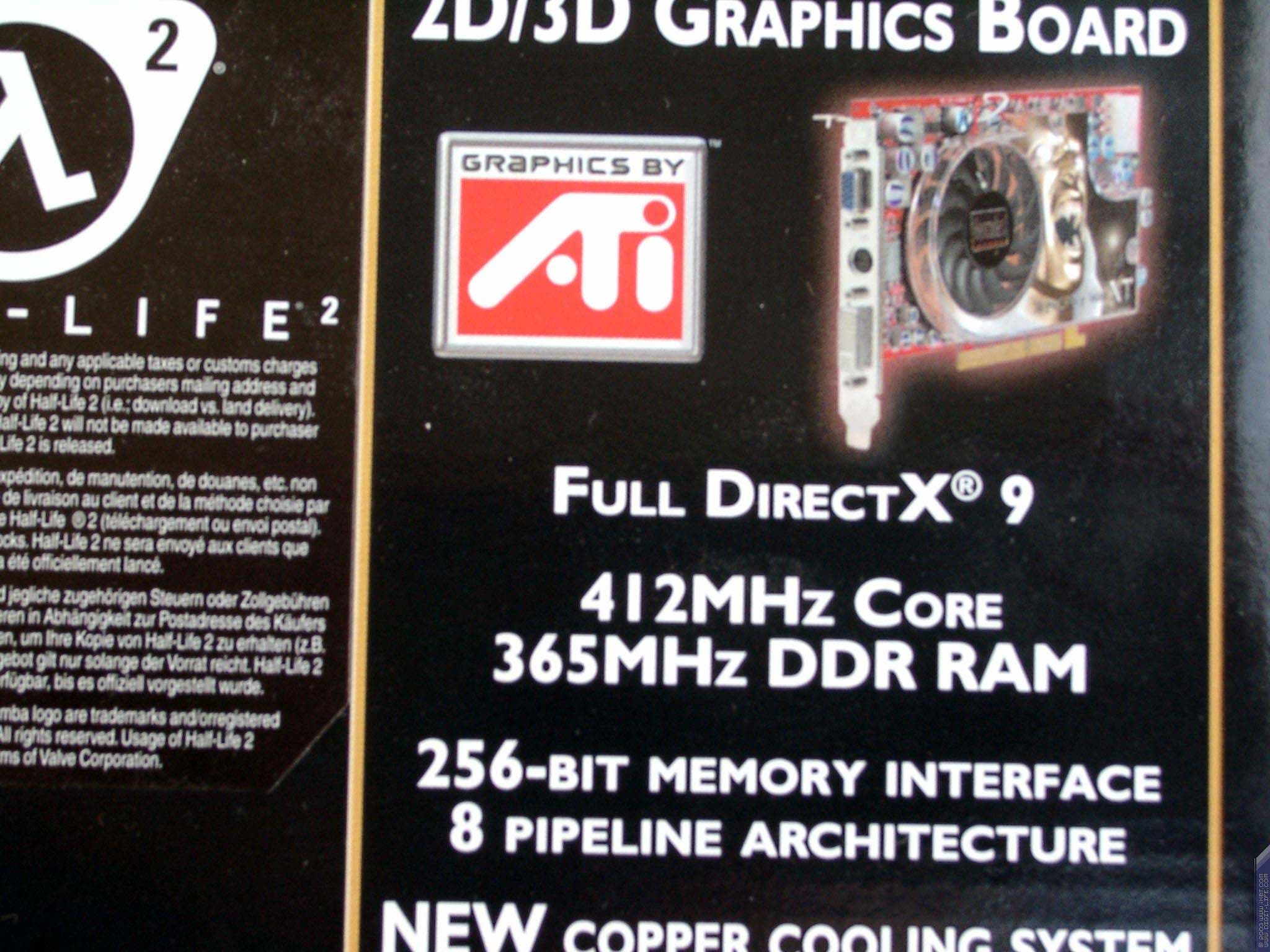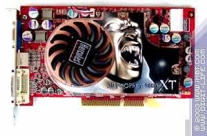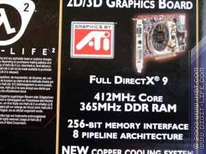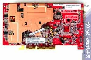 | Kарта имеет интерфейс AGP x8/x4, 256 МБ памяти DDR SDRAM , размещенной в 8-ми микросхемах на лицевой и оборотной сторонах PCB. Микросхемы памяти производства Hynix (маркировка HY5DU573222). Время выборки у микросхем памяти 2,5 ns, что соответствует частоте работы 400 (800) МГц, память же работает на частоте 365 (730) МГц. Частота работы GPU 412 MHz. Интерфейс обмена с памятью 256 бит. | ![]() |