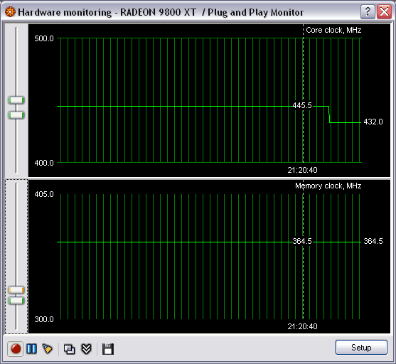 Так вот, на всех ранее протестированных нами RADEON 9800 XT частота поднималась изредка до 432 МГц, в основном это было — 418 МГц. А при включении этой функции на изделии от Hercules сразу установилось 445(!) MHz! . И лишь иногда после длительного тестирования частота опускалась до 432 МГц, что и засвидетельствовал мониторинг от RivaTuner: