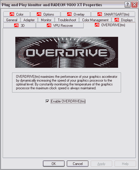 Вот здесь я коснусь того момента, из-за которого эта плата была названа самой мощной среди RADEON 9800 XT. Дело в том, что, начиная с версии драйверов CATALYST 3.8, для таких изделий появилась функция OverDrive, которая позволяет при определенных температурных условиях повышать частоту работы графического процессора.