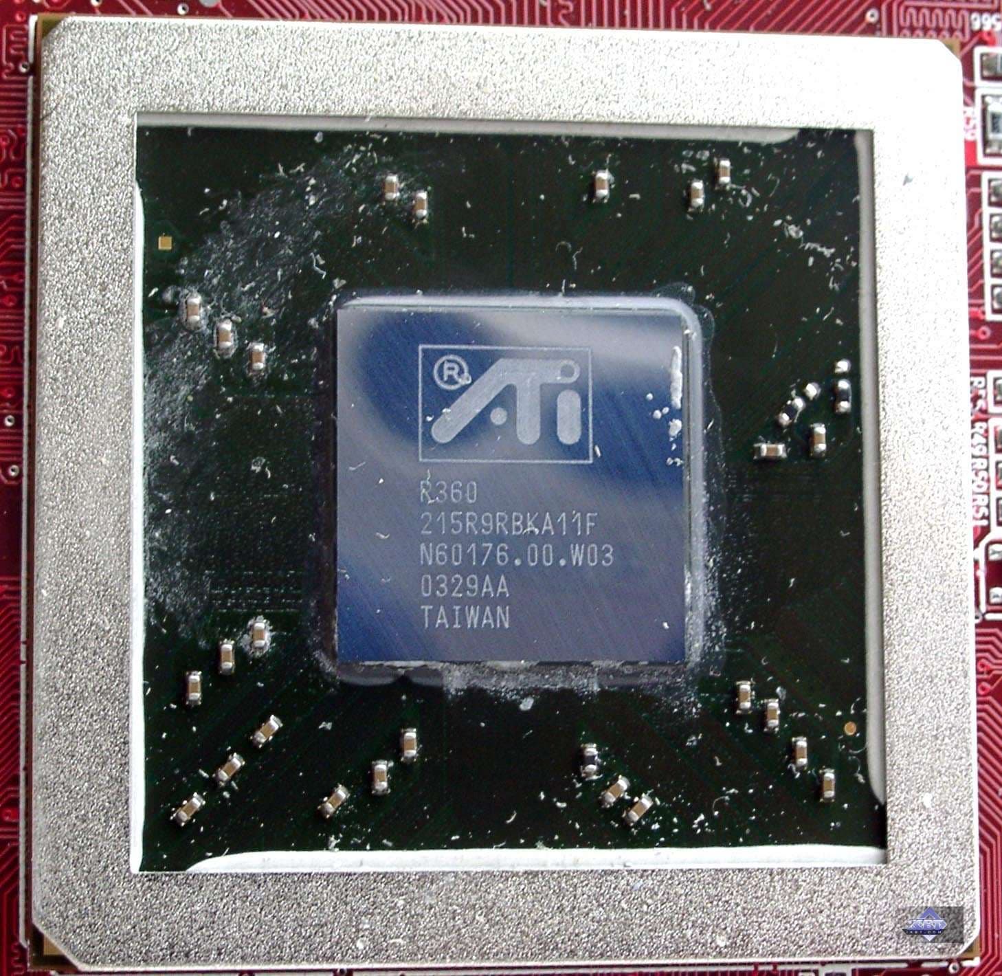Раз снимали кулер, то посмотрим и на графический процессор (как и R350, он имеет зеркальную поверхность):