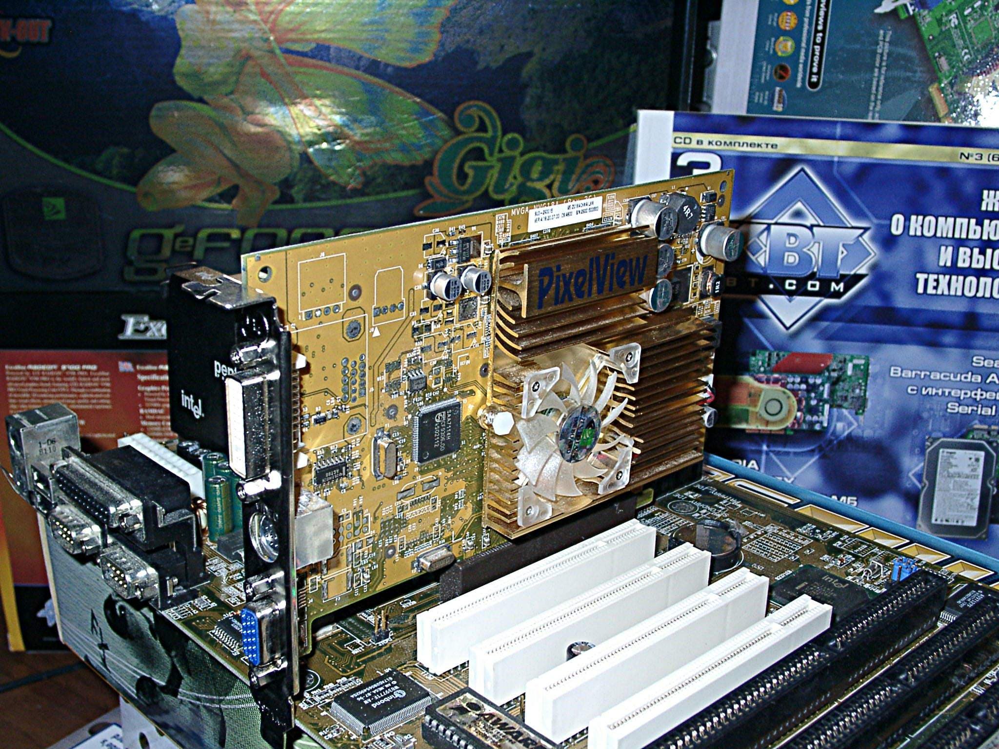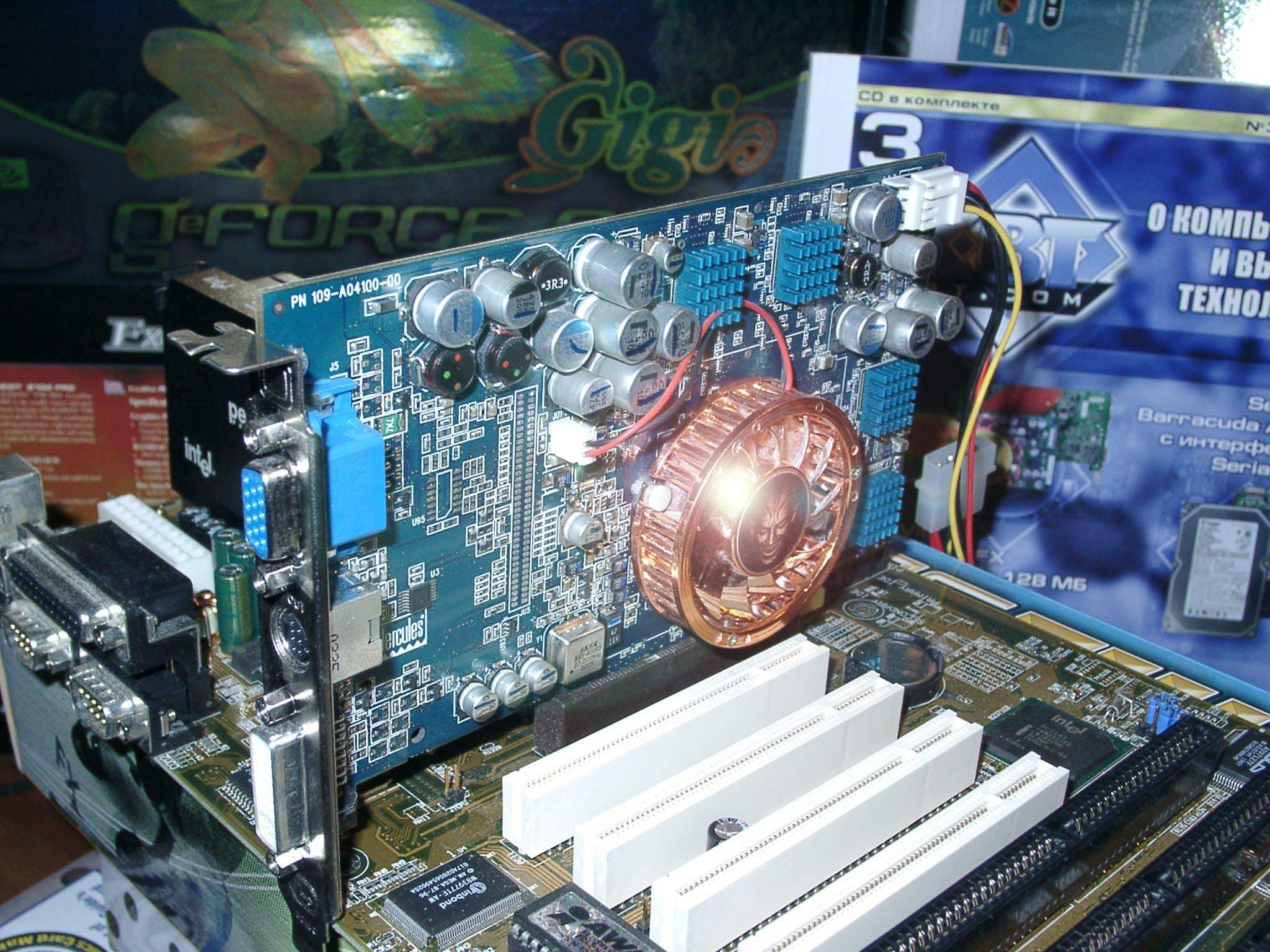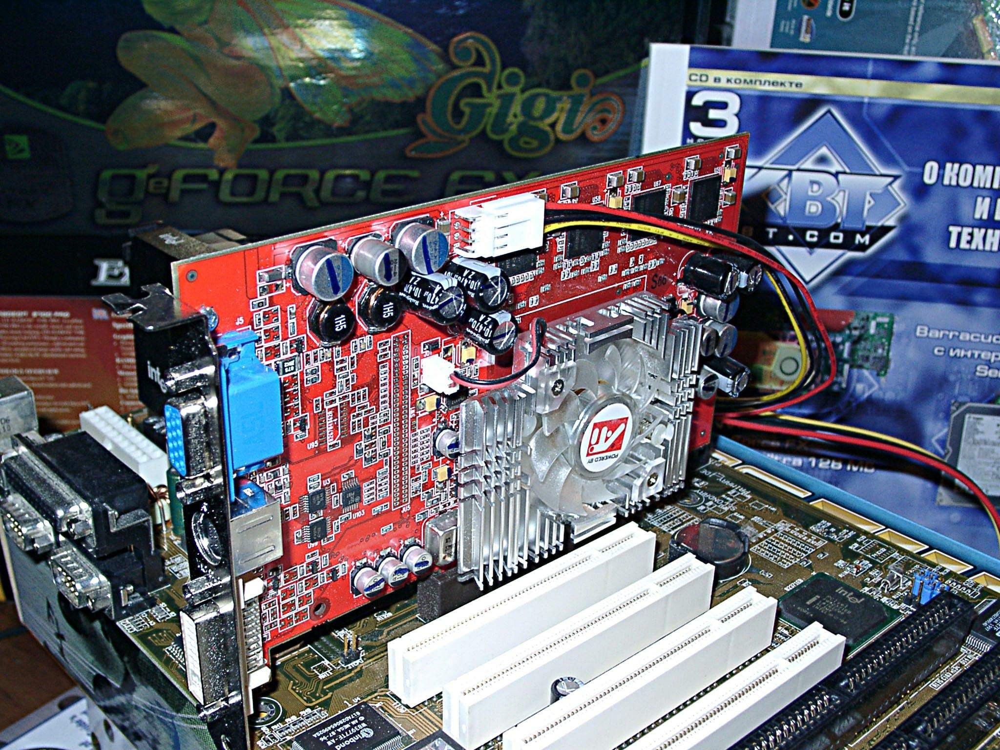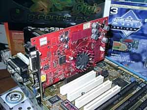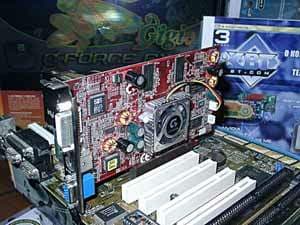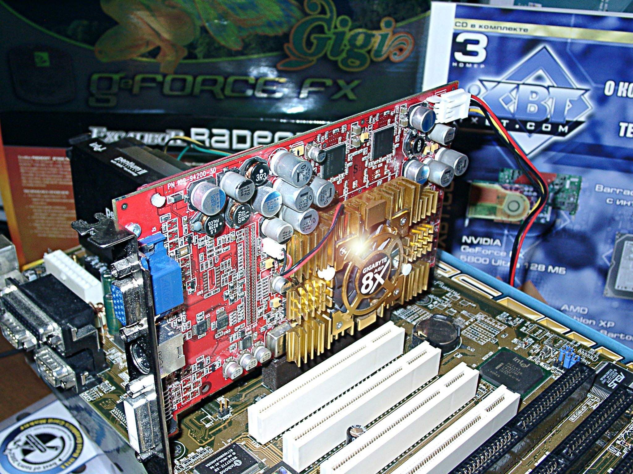 По сути тот же RADEON 9000, но с поддержкой AGP 8x. Карта от Gigabyte.