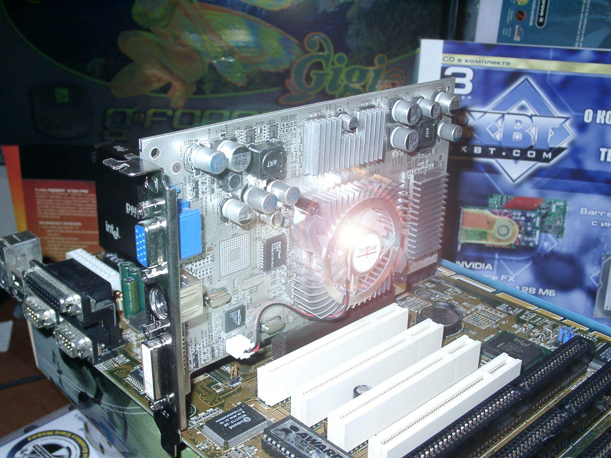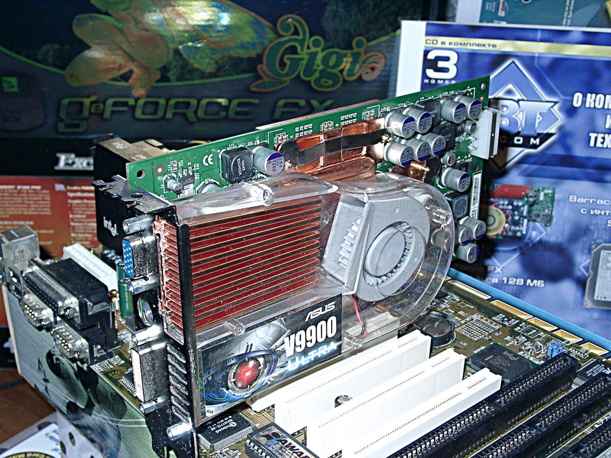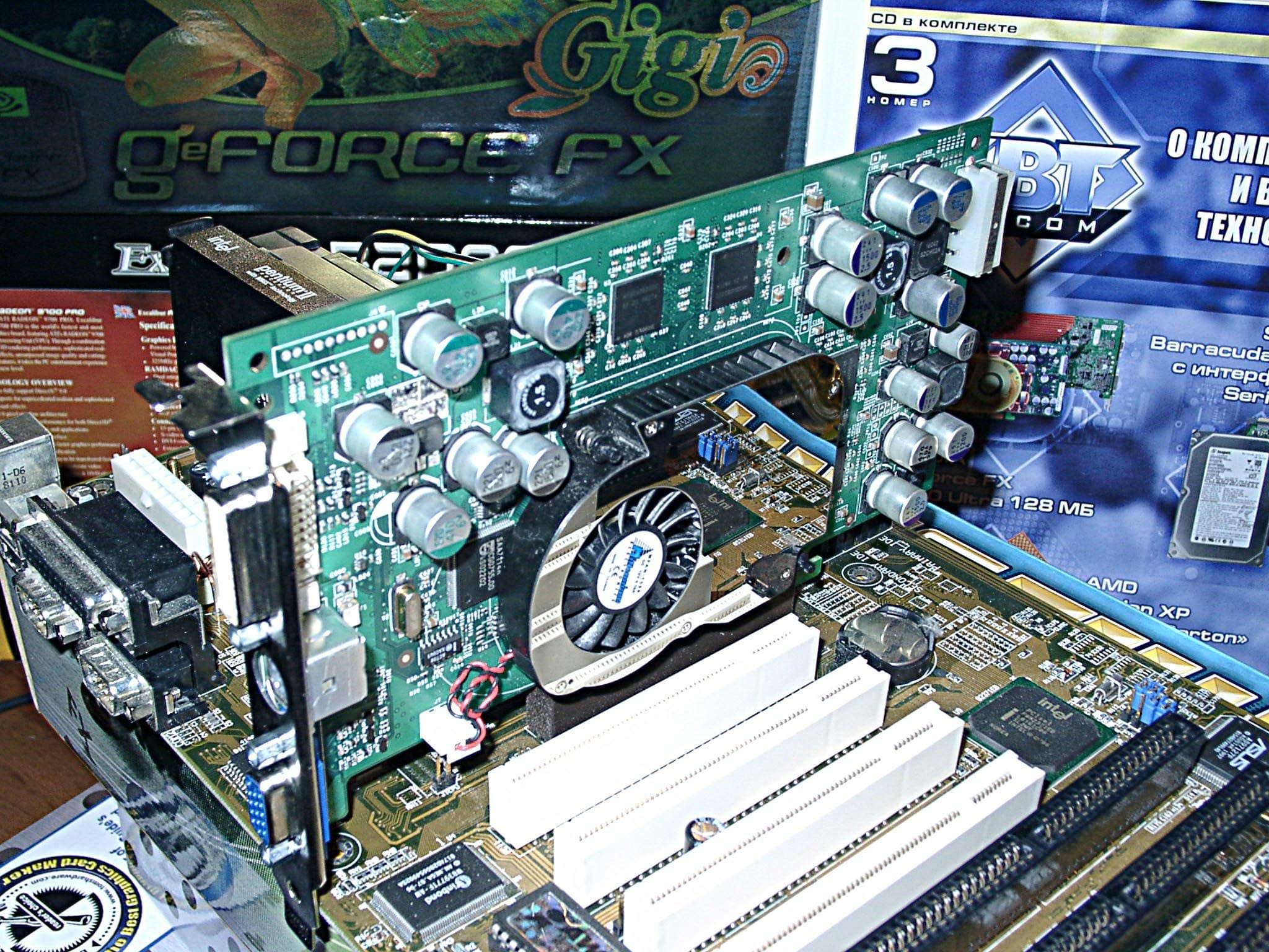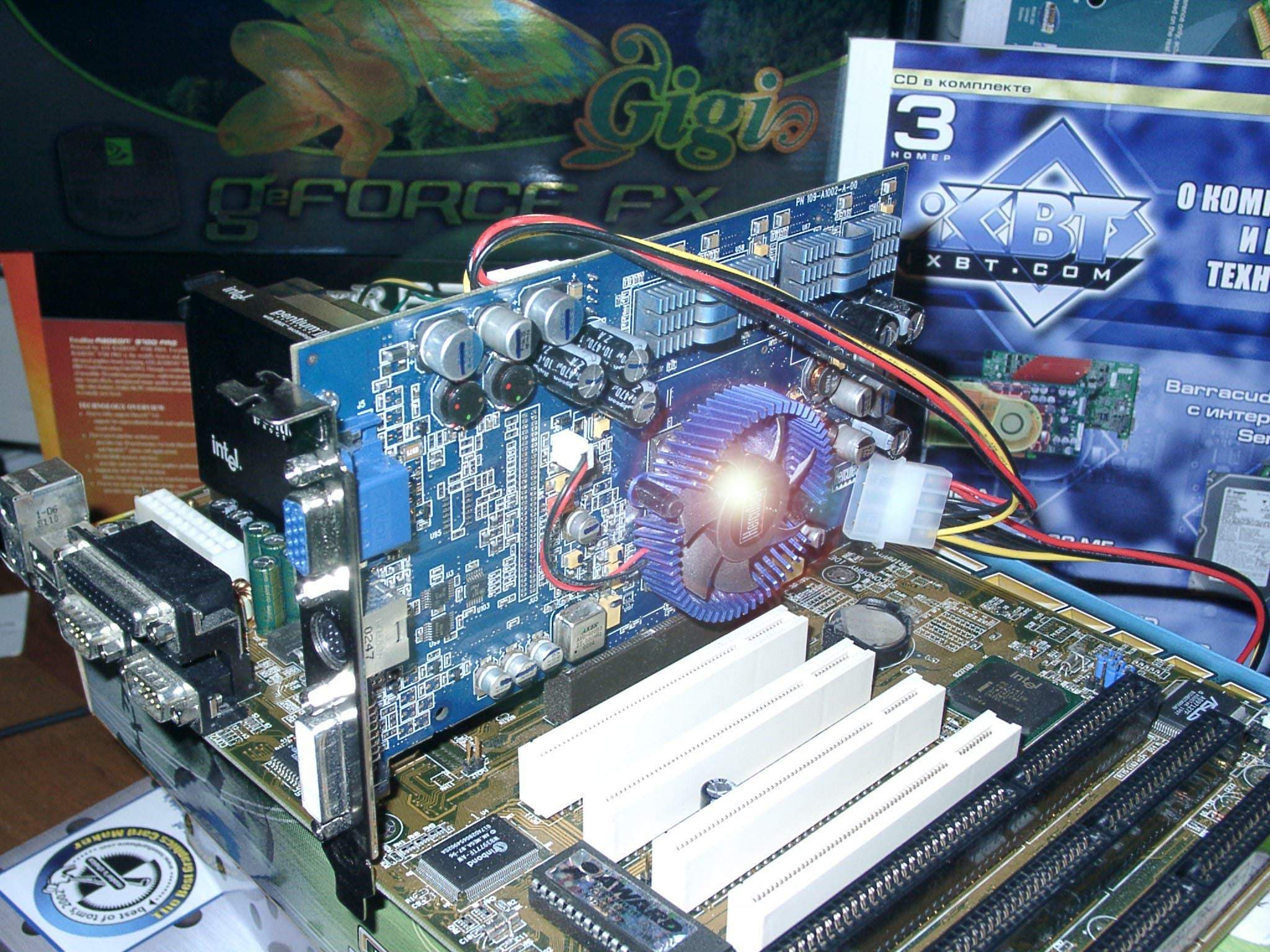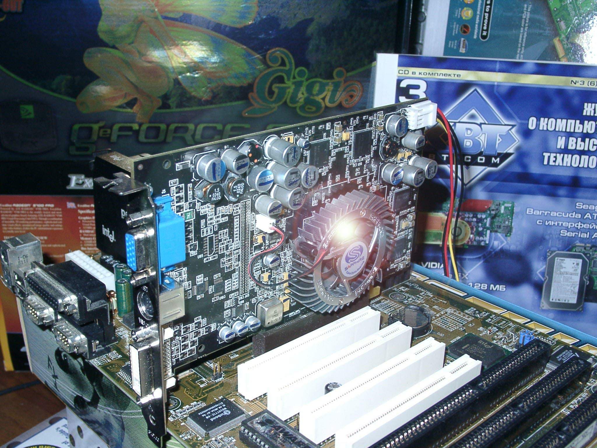 По сути тот же RADEON 9000, но с поддержкой AGP 8x. Карта от Gigabyte.