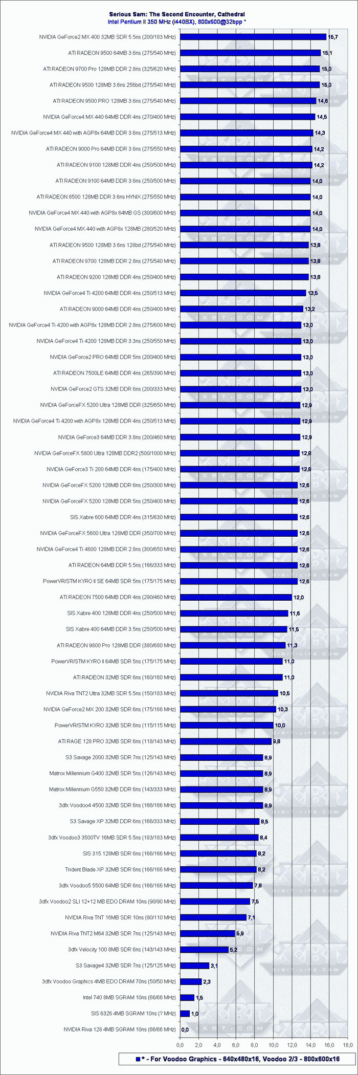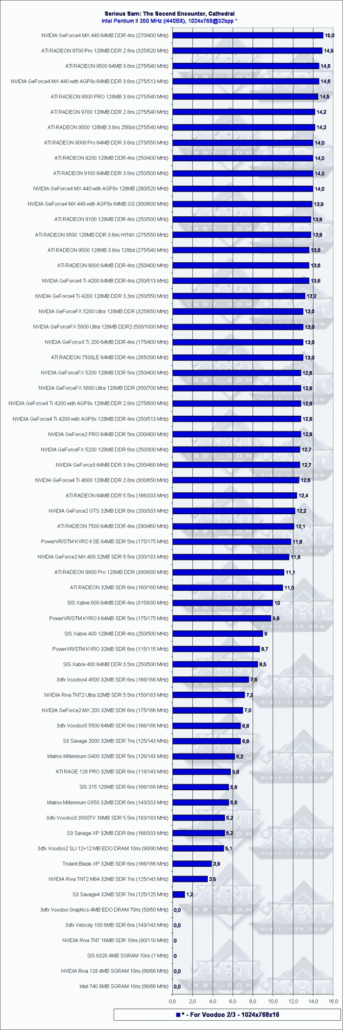- Serious Sam: The Second Encounter v.1.05 (Croteam/GodGames) OpenGL, мультитекстурирование, Grand Cathedral demo, настройки тестирования: quality, S3TC OFF