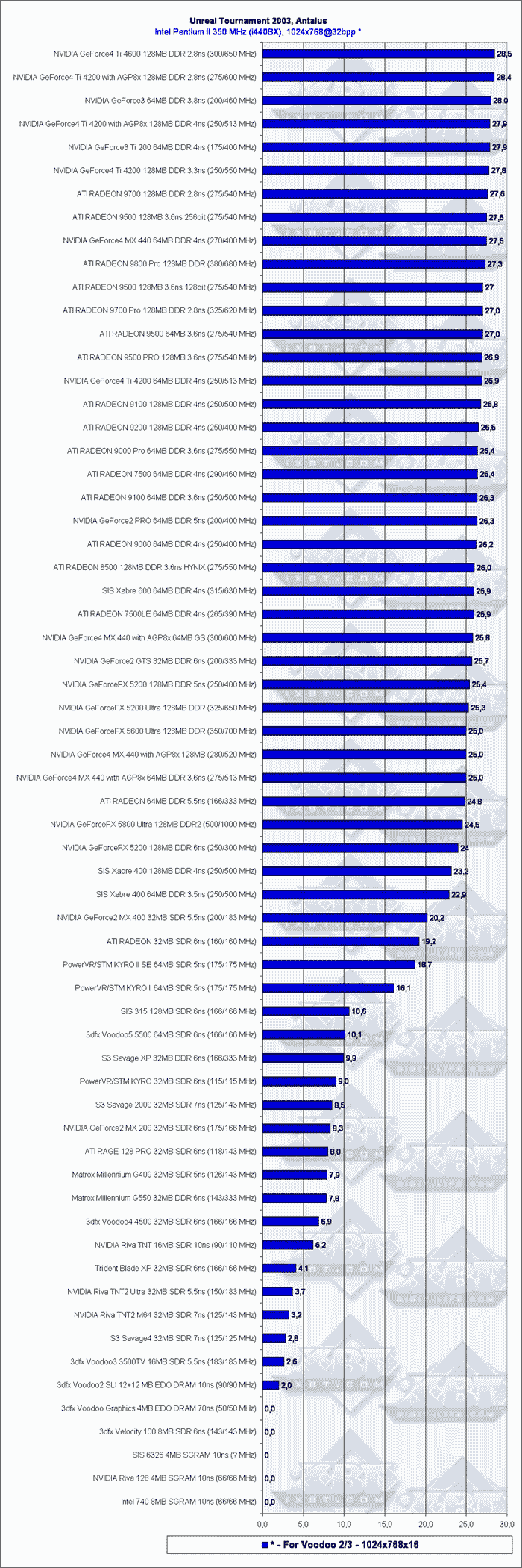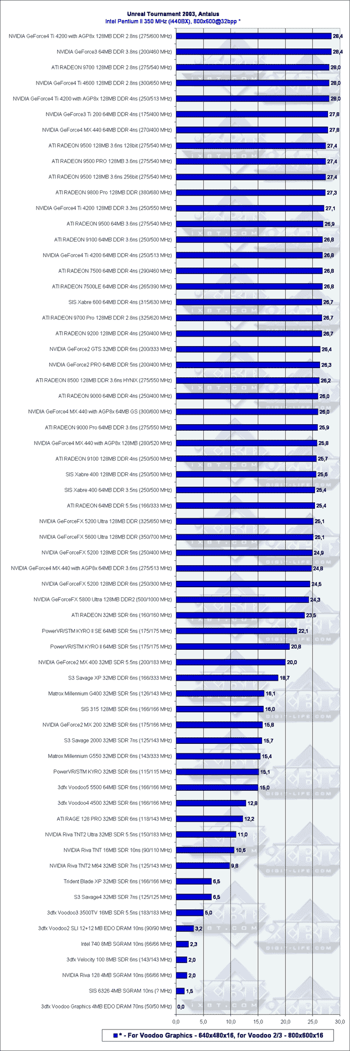 VSync отключен в драйверах, компрессия текстур отключена в приложениях. Детализация текстур High Quality. Результаты Voodoo2 SLI, Voodoo3, Voodoo Graphics, Riva128, i740 получены в 16-битном цвете, у всех остальных карт - в 32-битном. Voodoo Graphics протестирована была в разрешении 640х480.