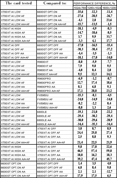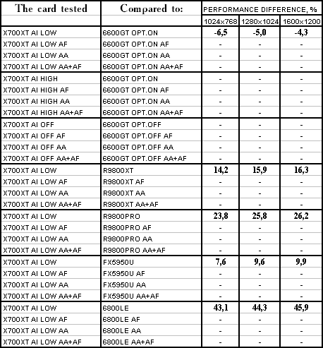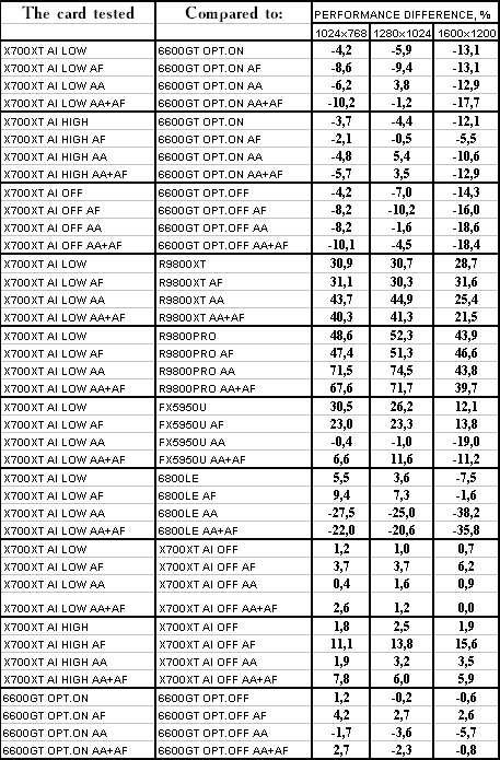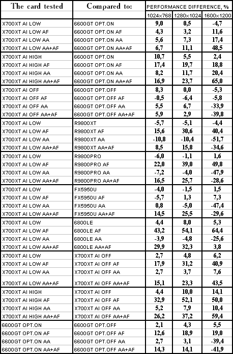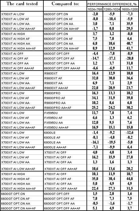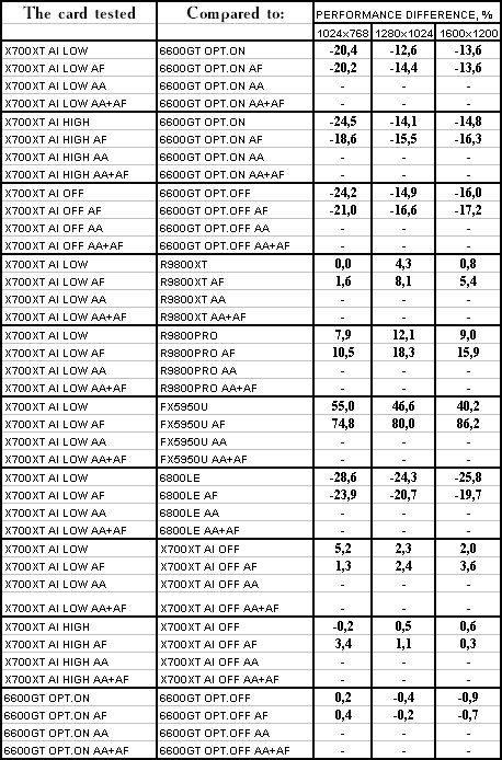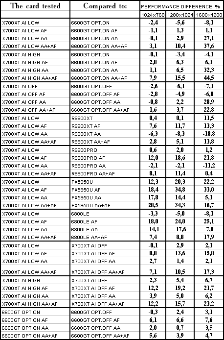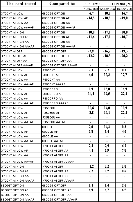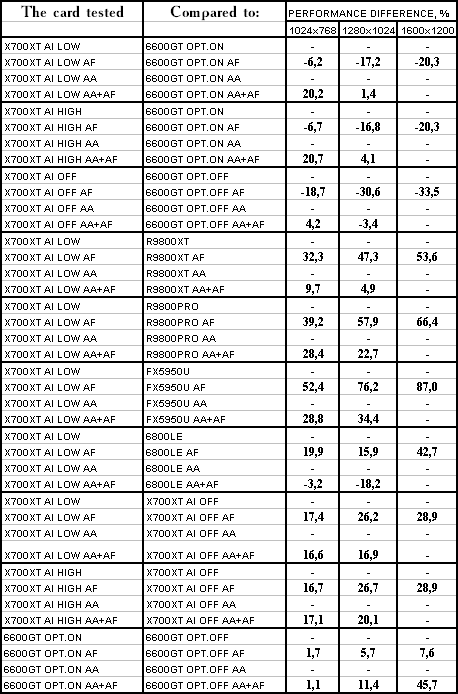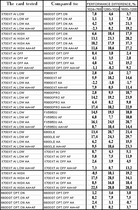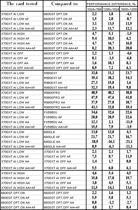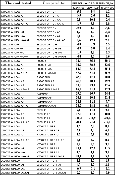 Думаю, что нет смысла рассматривать сравнение X700XT/6600GT по режимам, когда и так видно, что X700XT проиграл полностью!