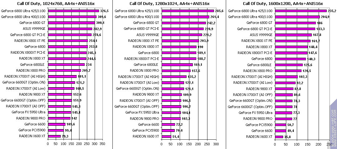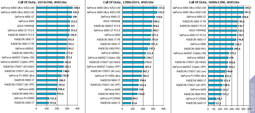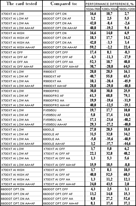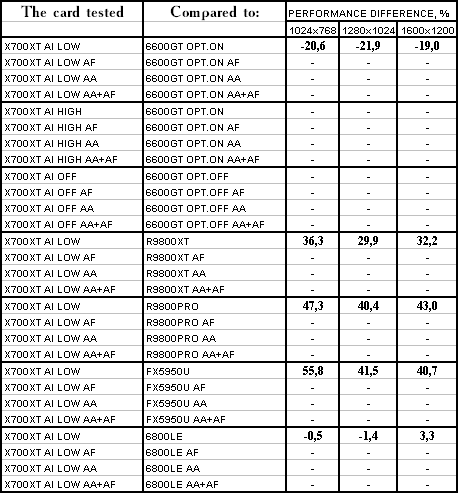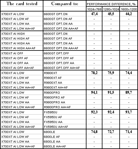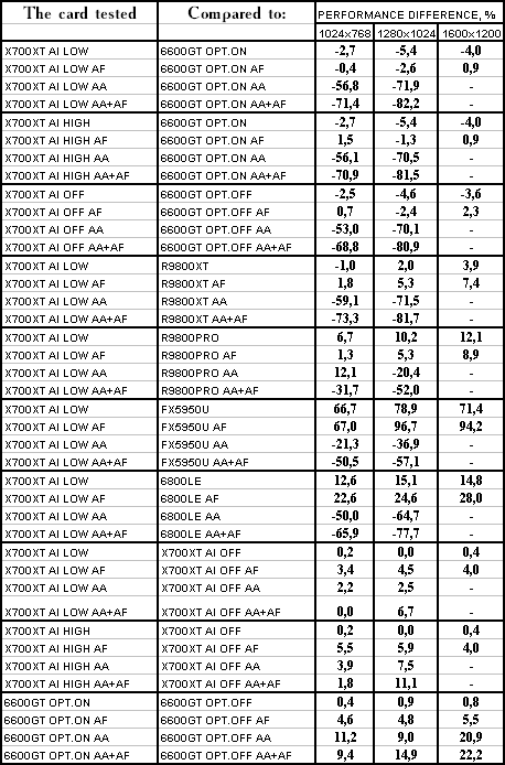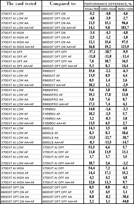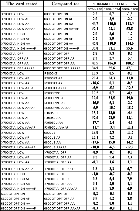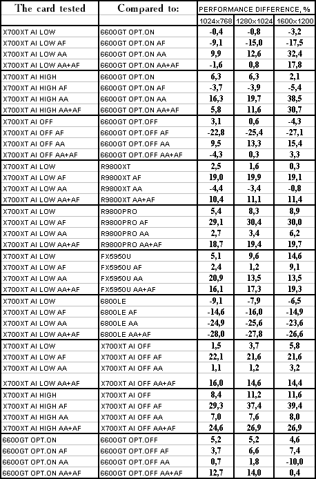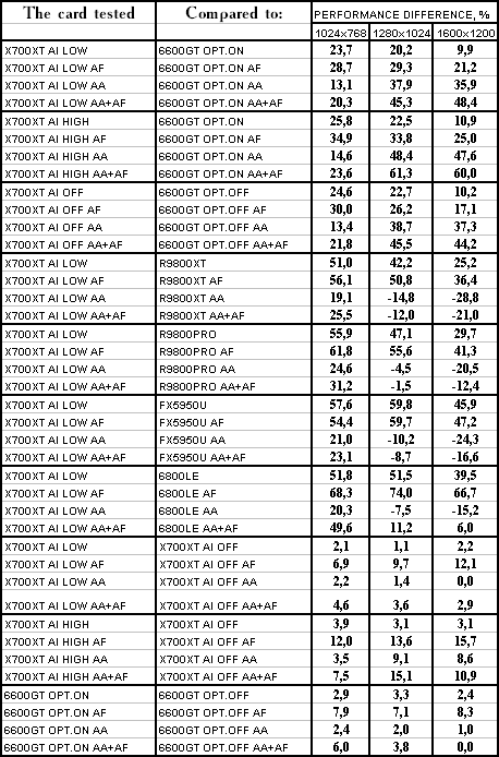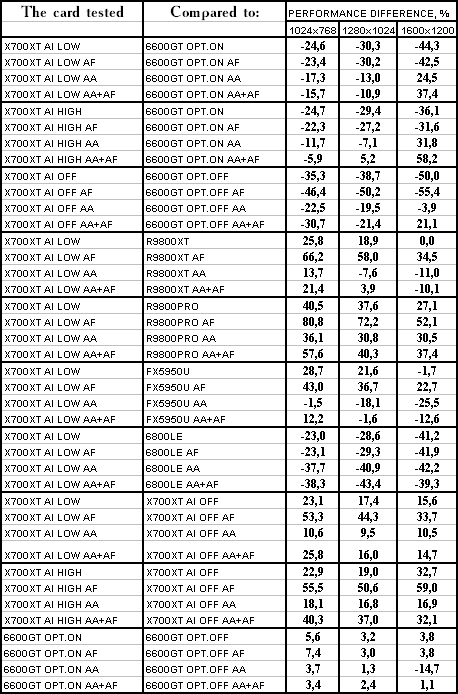 Думаю, что нет смысла рассматривать сравнение X700XT/6600GT по режимам, когда и так видно, что X700XT проиграл полностью!