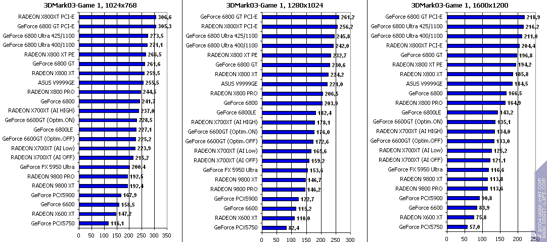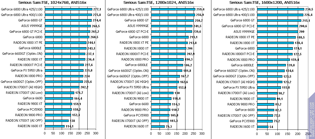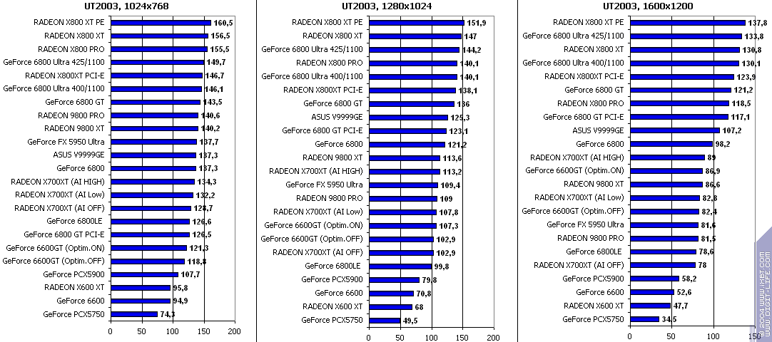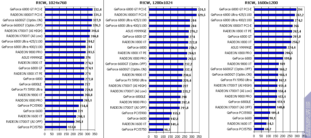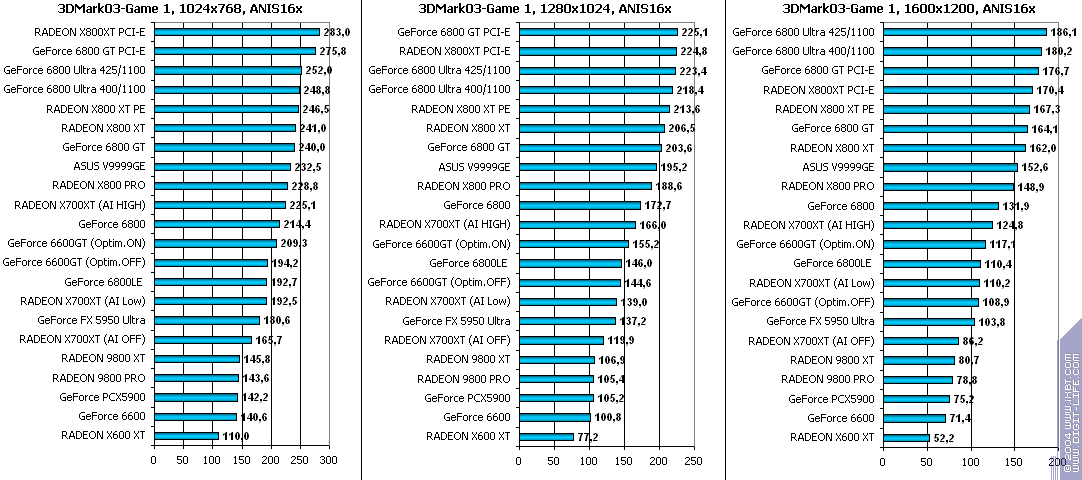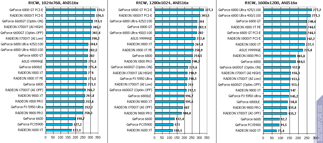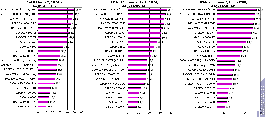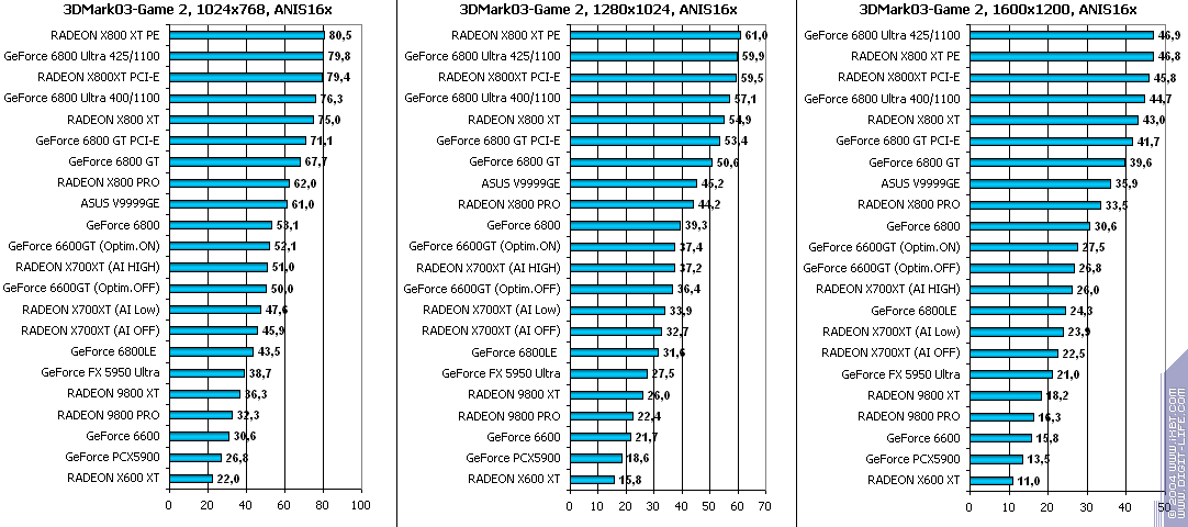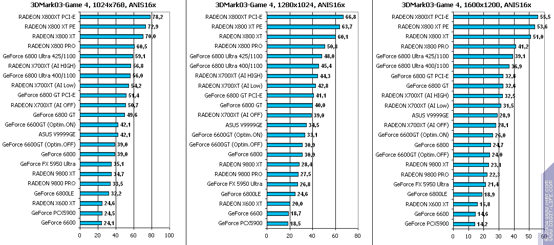 - RADEON X700XT — против RADEON 9800 XT (ATHLON64 3400+) аналогично (лишь уже в высоких разрешениях низкая ПСП у X700XT подпортила дело);