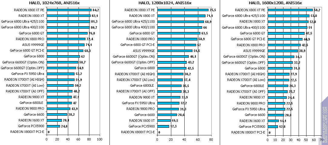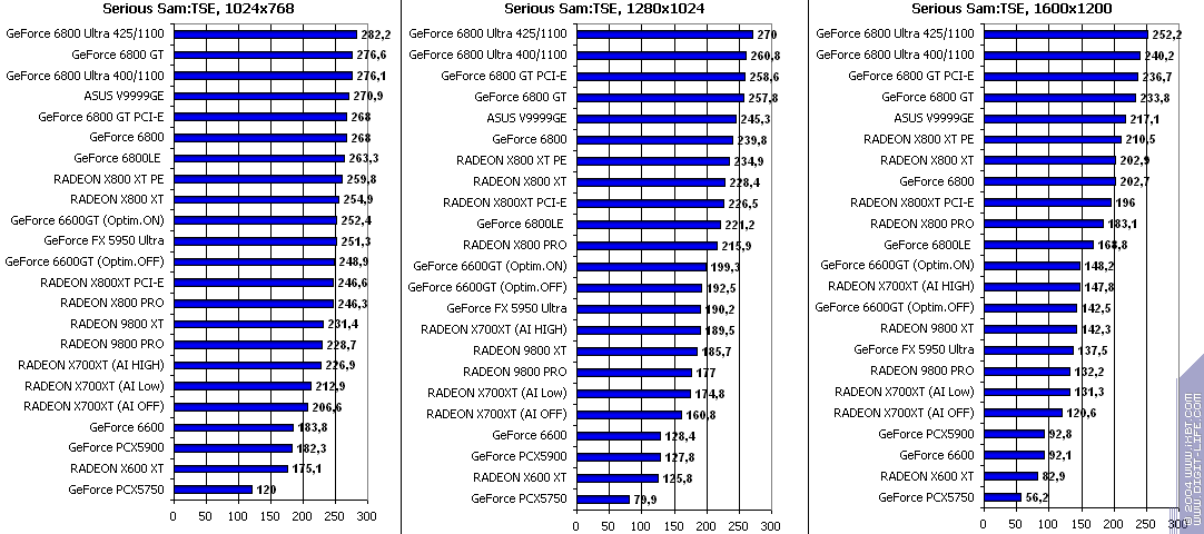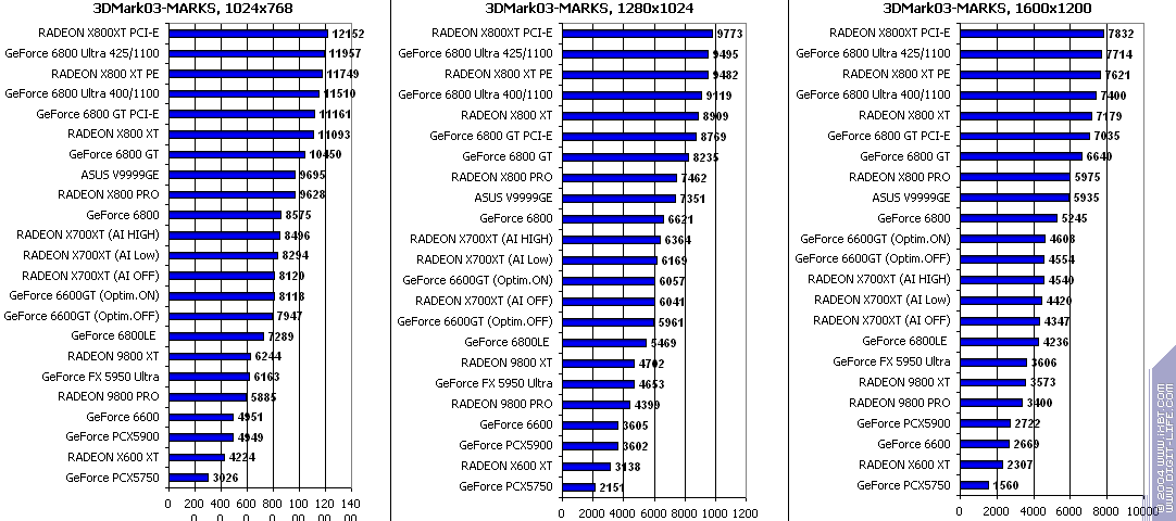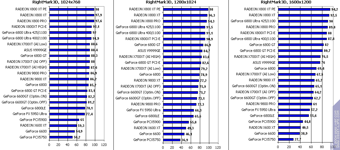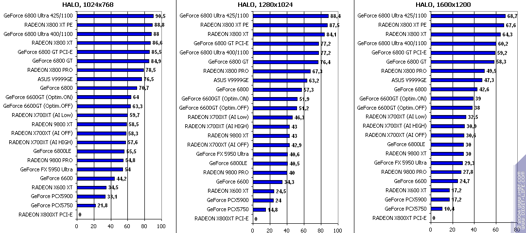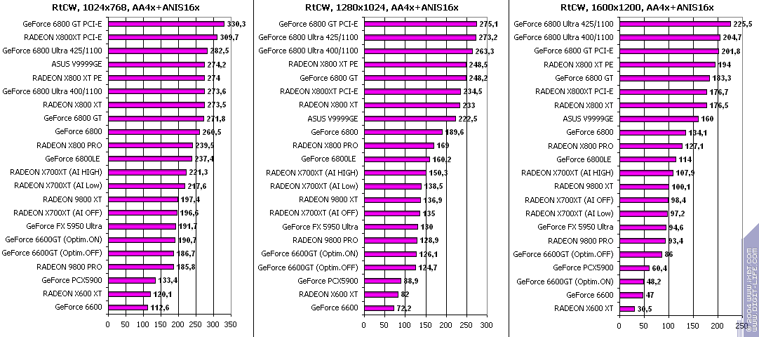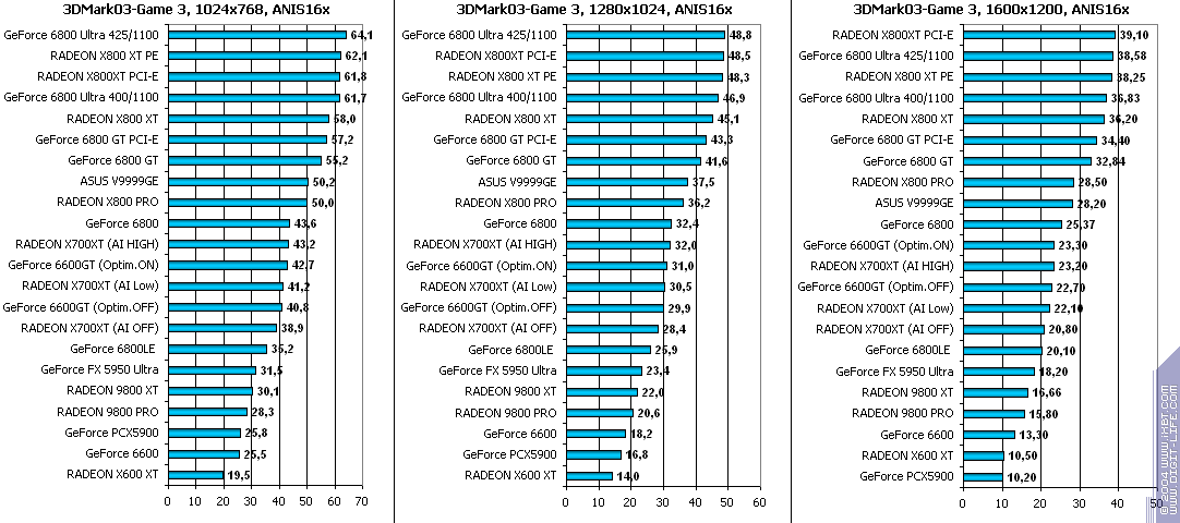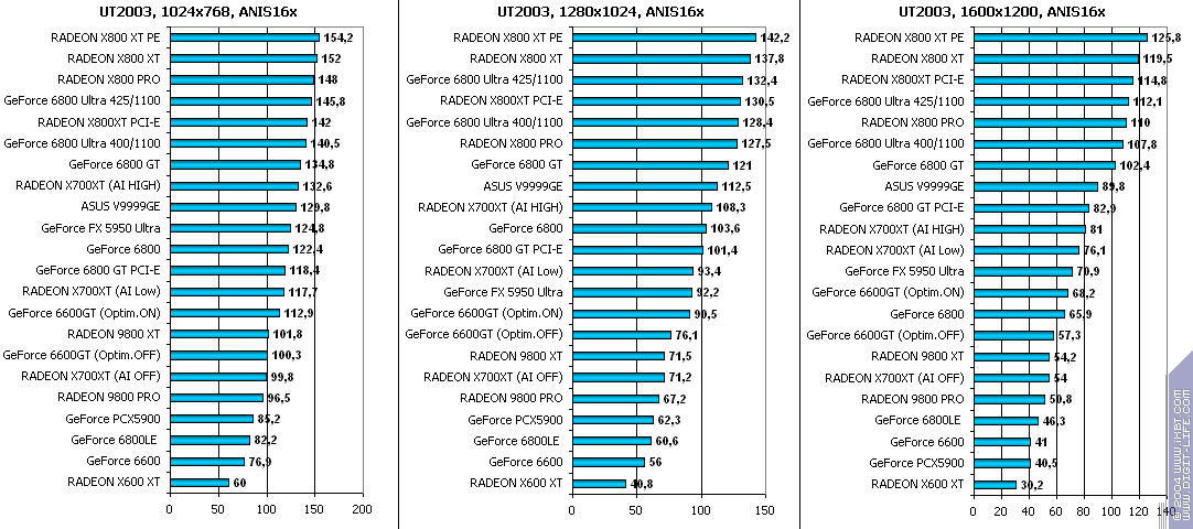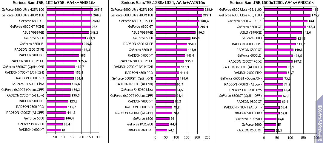 - RADEON X700XT — против RADEON 9800 XT (ATHLON64 3400+) аналогично (лишь уже в высоких разрешениях низкая ПСП у X700XT подпортила дело);