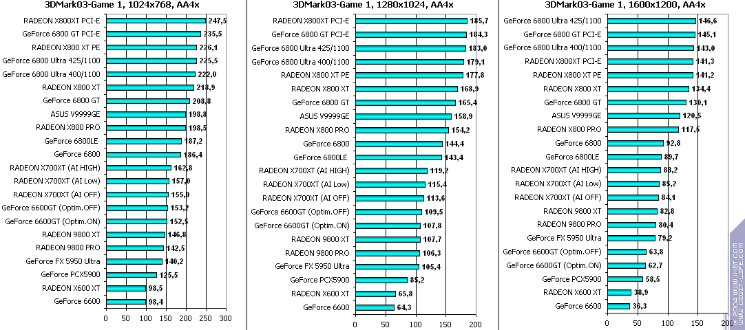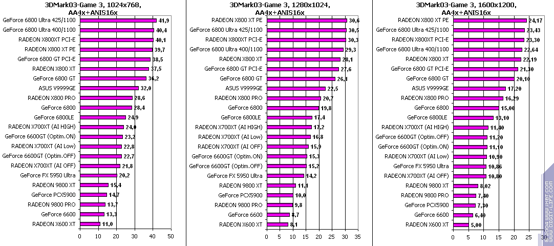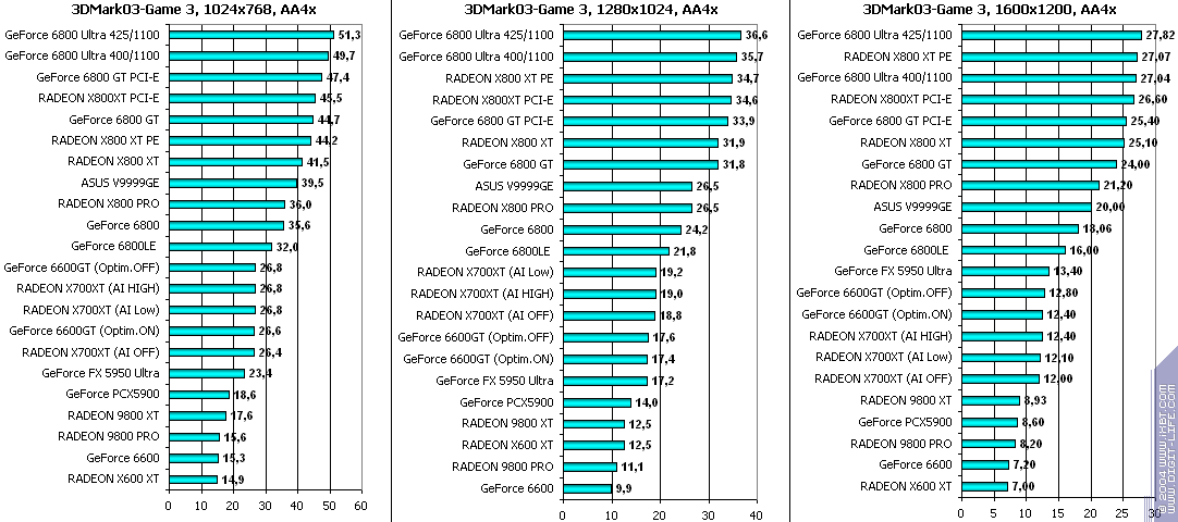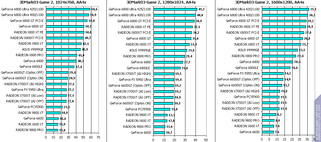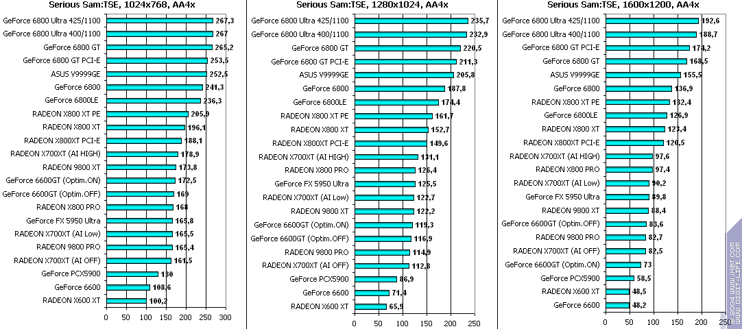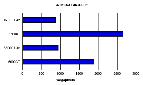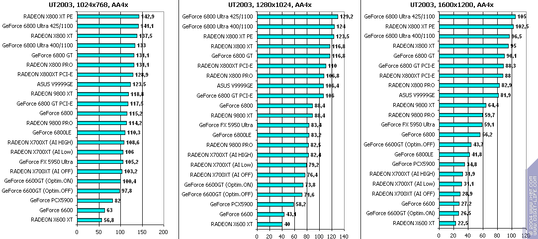 При включенном АА: победа за X700XT! Снова засчет того, что у 6600GT отложенная запись во буфер кадра, что при АА сказывается очень негативно.