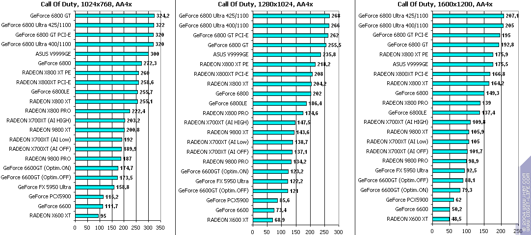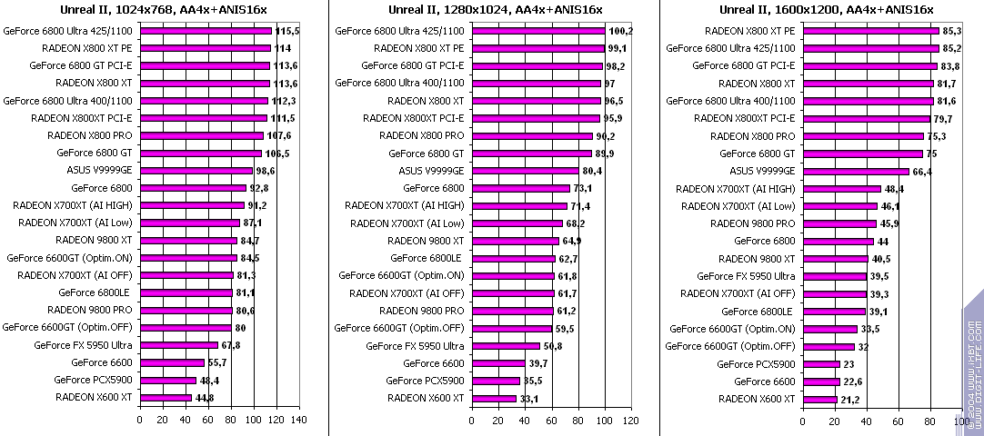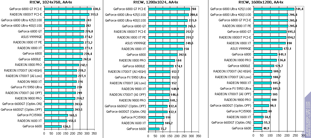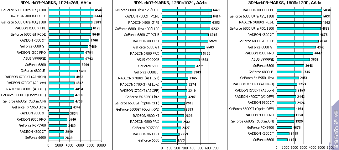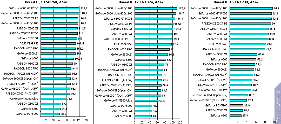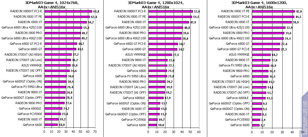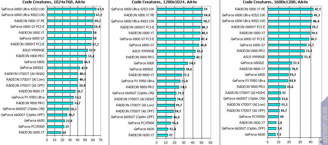 При включенном АА: победа за X700XT! Снова засчет того, что у 6600GT отложенная запись во буфер кадра, что при АА сказывается очень негативно.