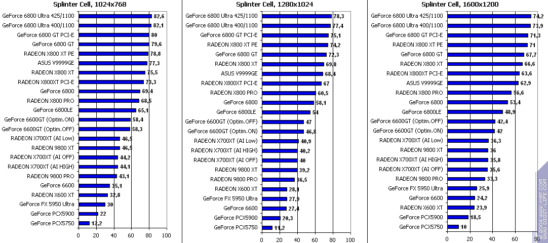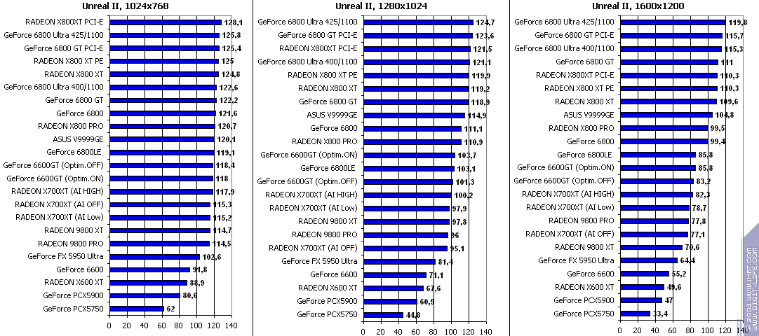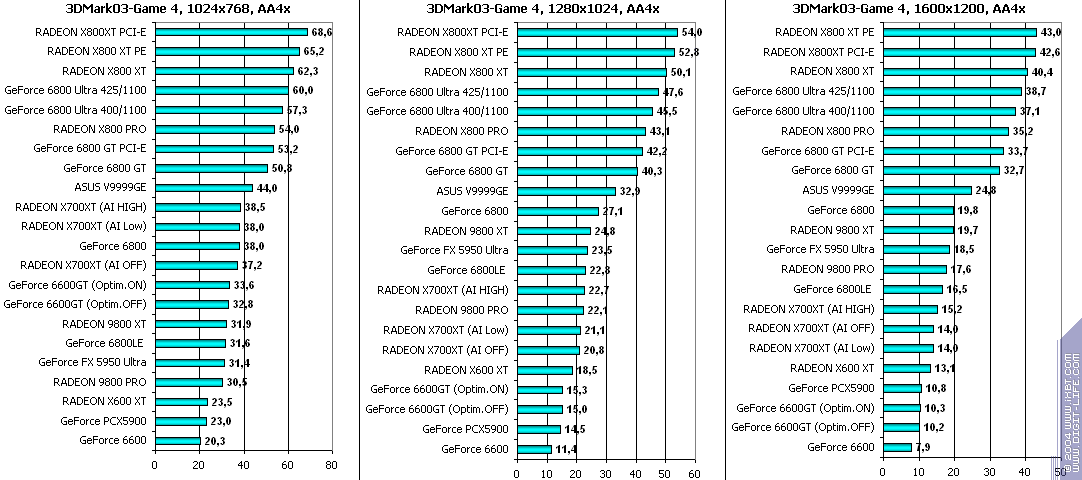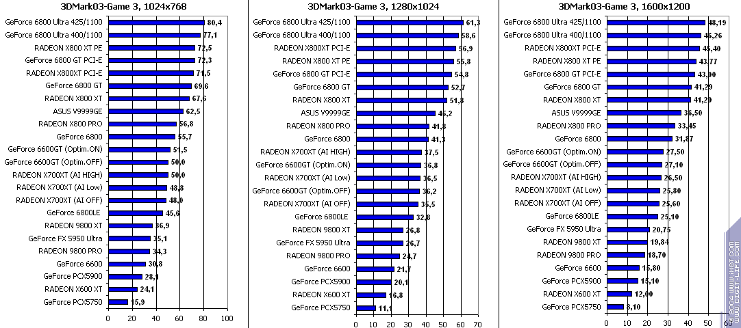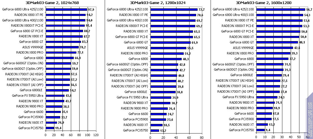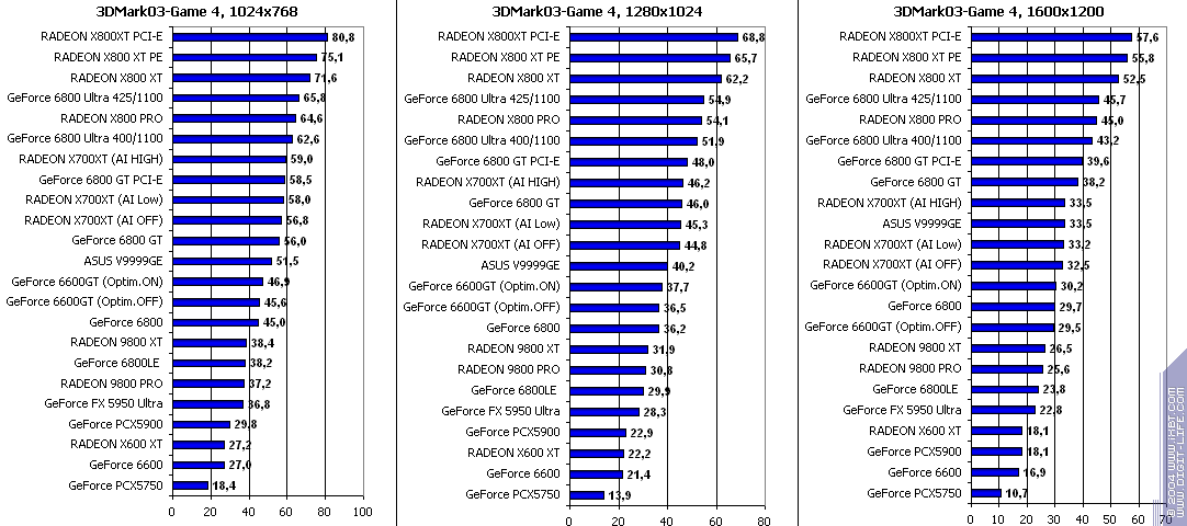 - RADEON X700XT — против GeForce 6800LE (ATHLON64 3400+) условный паритет;