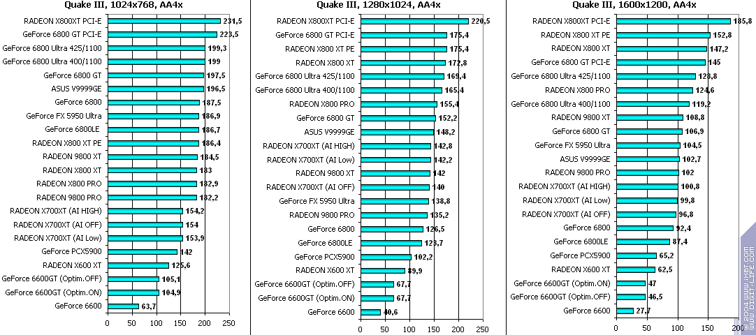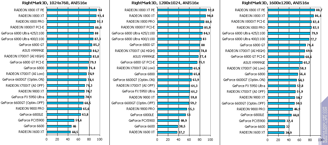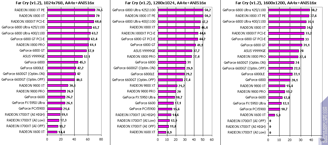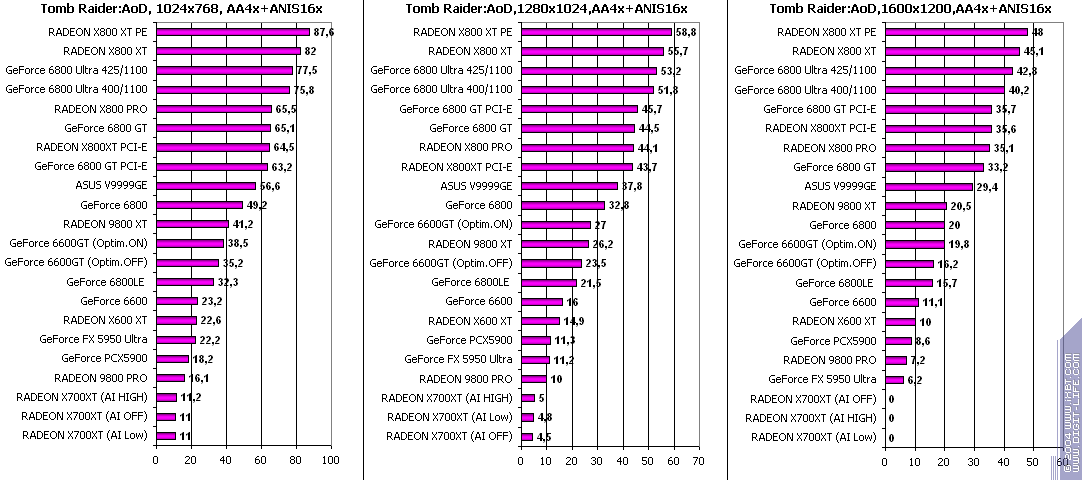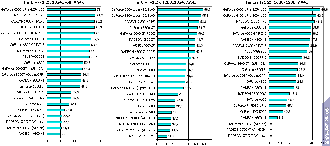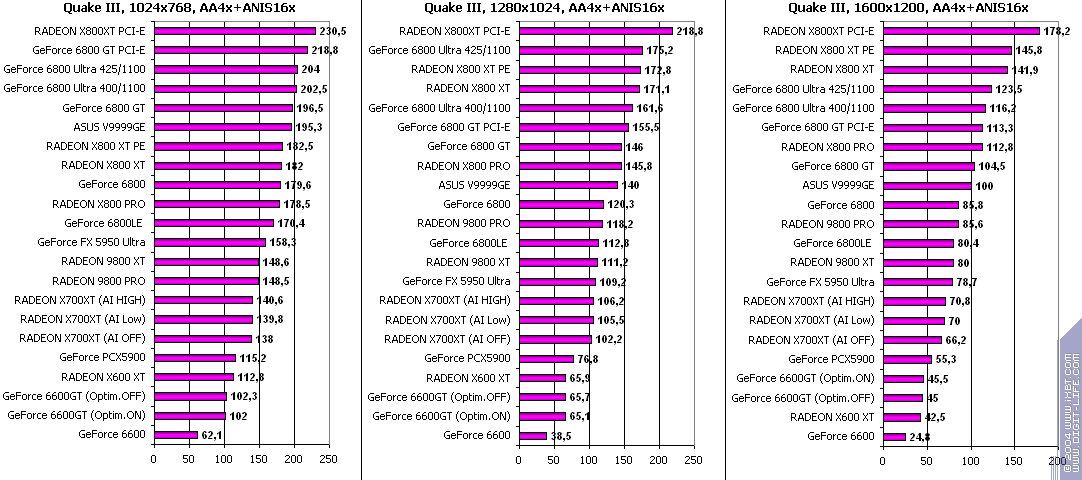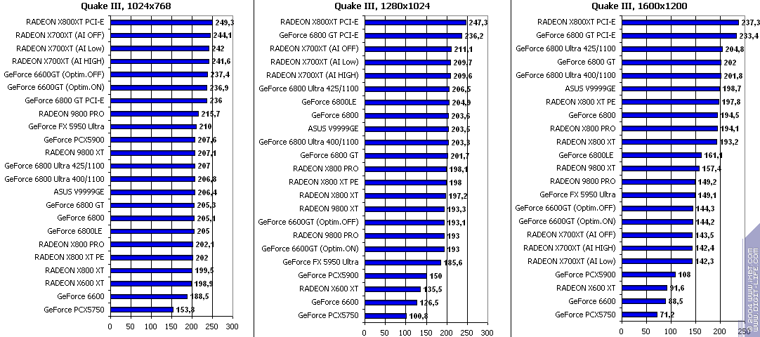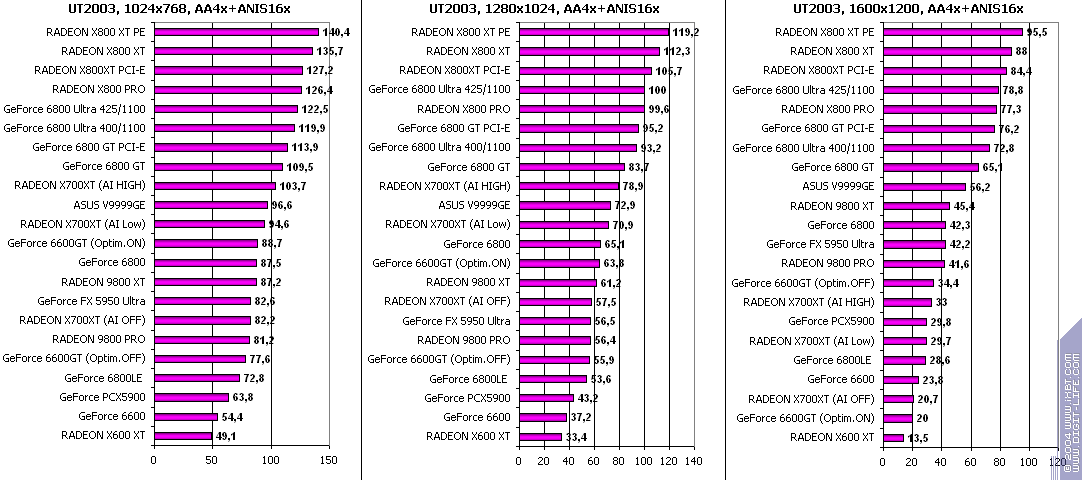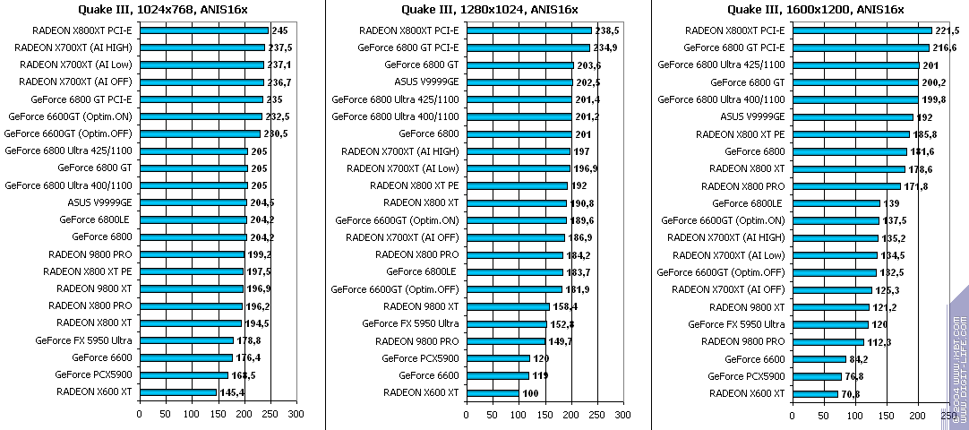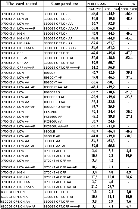 - RADEON X700XT — против GeForce 6600GT победа только при High A.I.;